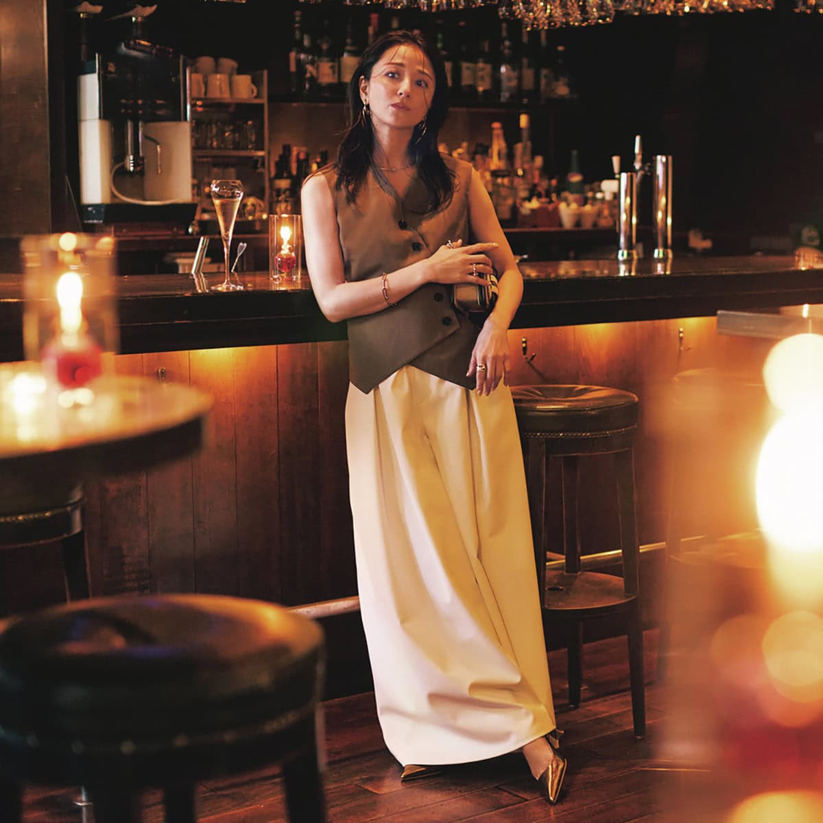 ジレ¥59,400(エステータ/オンワード樫山 お客様相談 室)パンツ¥42,900(LE PHIL/LE PHIL NEWoMan 新宿店)バッグ¥157,300(ピエール アルディ/ピエール アルディ 東京)パンプス¥17,600(ダイアナ/ダイ アナ 銀座本店)ピアス¥39,600ブレスレット¥ 61,600リング[右手親指]¥59,400リング[右手薬指] ¥47,300(すべてブランイリス/ブランイリス トーキョー)チョーカー¥23,320 (エムシー・スタジオ/ズットホリック)リング[左手]¥41,800(プラウ)