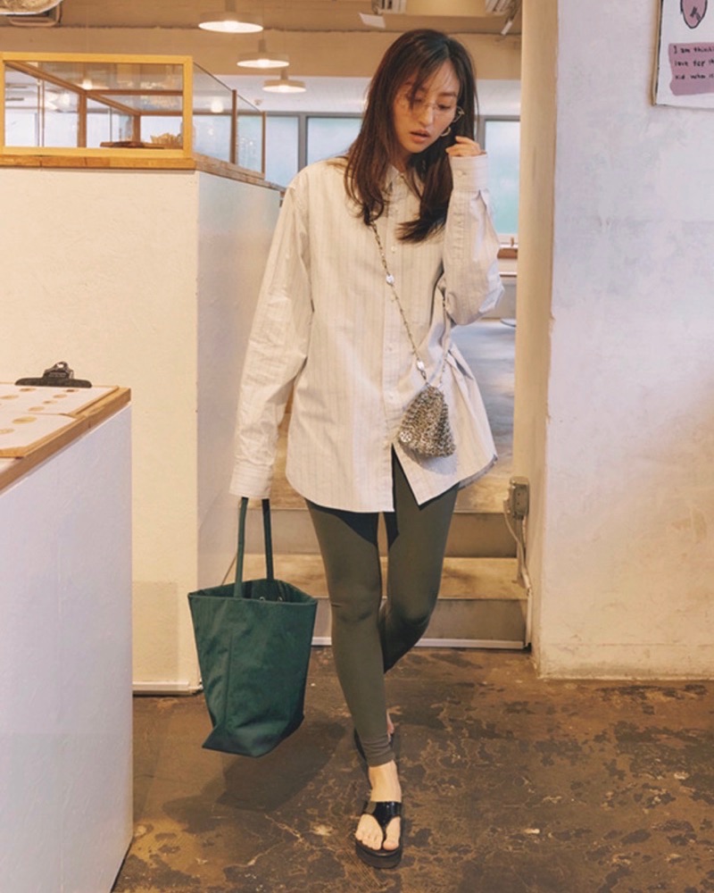 シャツ[メンズ]¥22,000(カルバン・クライン/カルバン・クライン カスタマーサービス)レギンス¥13,800(ルルレモン/ルルレモン 客様窓口)ショルダーバッグ¥138,490(rabanne/NUBIAN)トートバッグ¥28,600(MARY AL TERNA/Al Design)サンダル¥7,590(ATELIER BRUGGE/アトリエブルージュ)メガネ¥52,800(アイヴァン/アイヴァン 東京ギャラリー)ピアス¥16,500(JAMIR/エルディスト ショールーム)