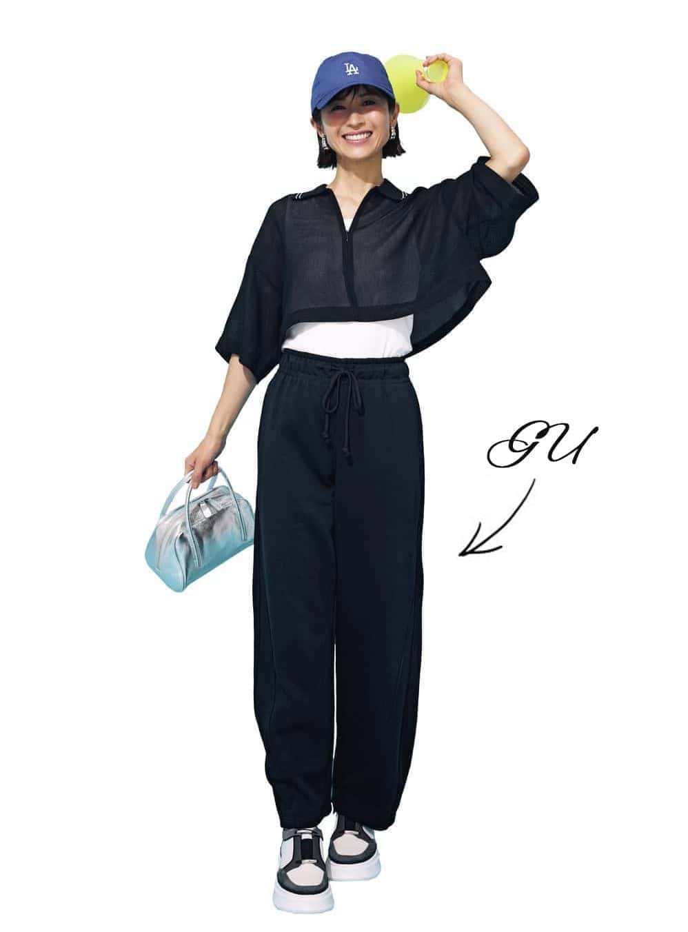 スウェットパンツ¥2,990(GU)メッシュポロ¥7,480(STYLEMIXER)2WAYタンクトップ¥4,990(PLST)バッグ¥23,100〈AULENTTI〉スリッポン¥13,750〈ル タロン〉(ともにル タロン 有楽町マルイ店)キャップ¥4,840(ニューエラ × マイカ アンド ディール/マイカ アンド ディール 恵比寿店)イヤリング¥8,800(アビステ)