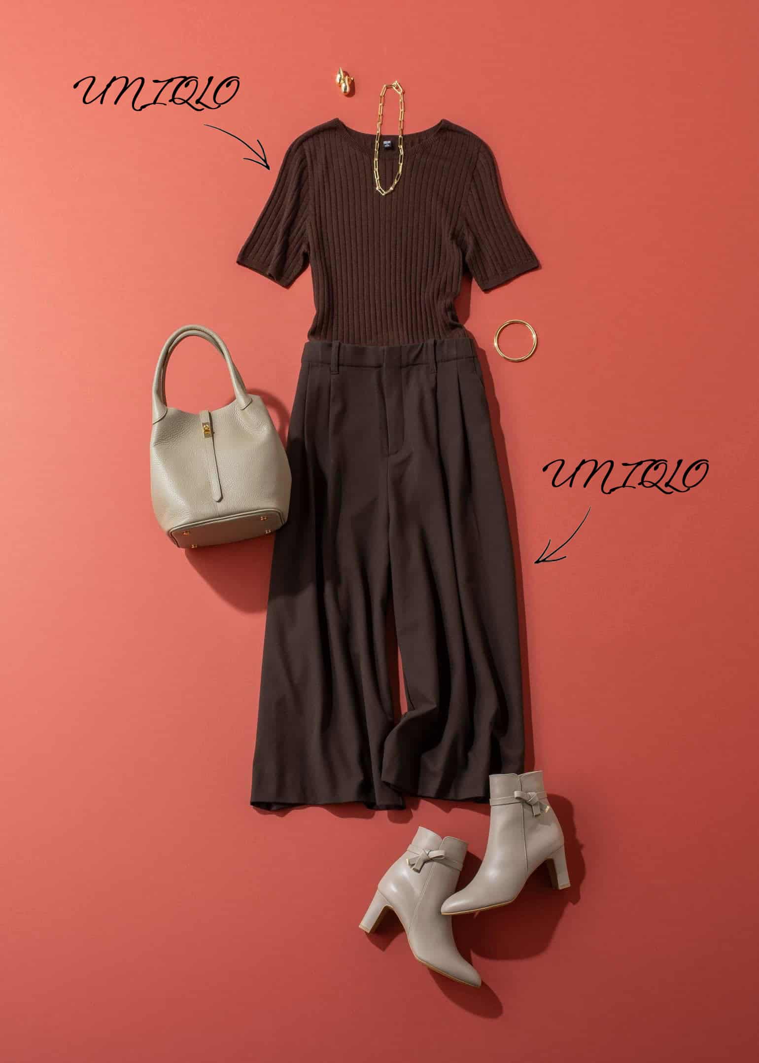 ダークブラウンの半袖ニットに、同系色のキュロットを合わせた大人のワントーン。洗練されたシルエットのユニクロアイテムなら、落ち感生地で体の線を拾わずに、きちんと見えを叶えます。ライトグレー小物で明るさを足して、秋口の軽やかさを演出。
