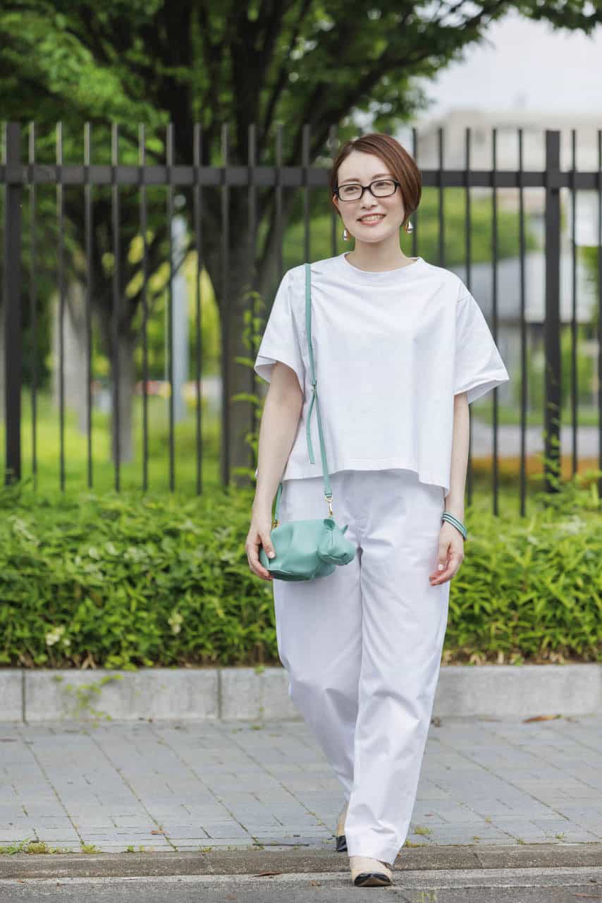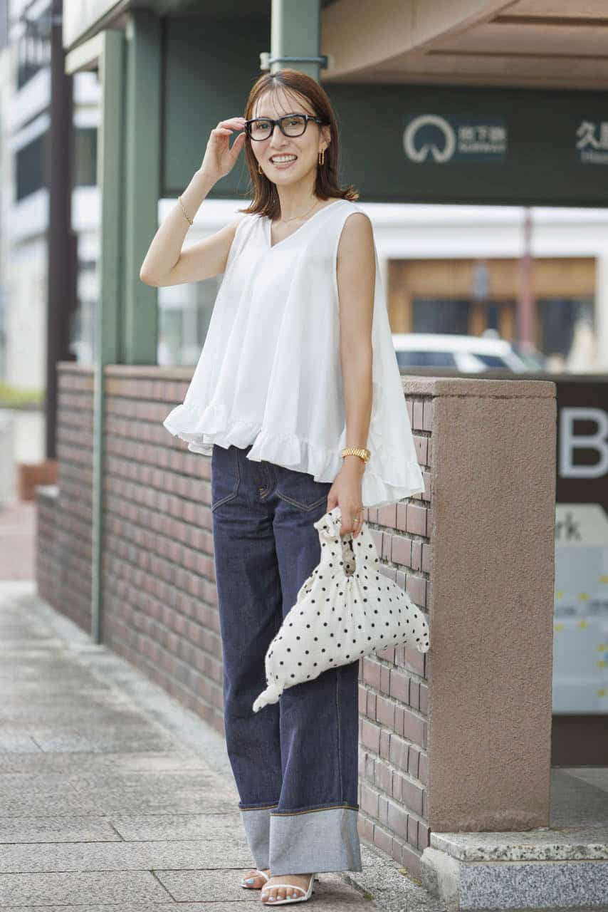 シンプルなコーデが好きですが、ちょっと物足りないな…という日はメガネをひとつ足すだけで、ぐっとこなれ感が出ます。いつものマンネリコーデも気分を変えてくれる、私のお助けアイテム。ホワイト×デニムで爽やかさを意識しつつ、シンプルになりすぎないようにアイウェアとドットのバッグでアクセントを。