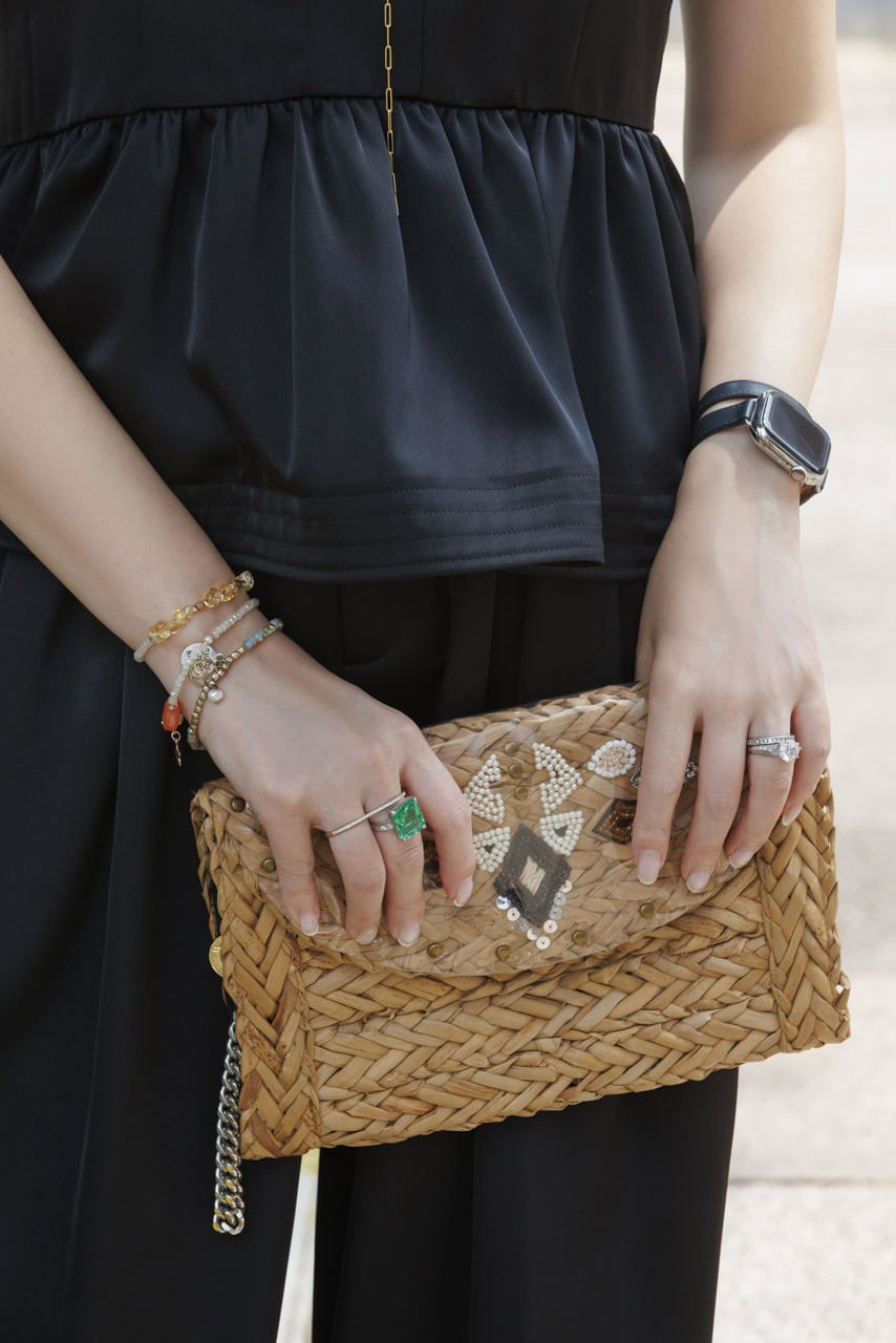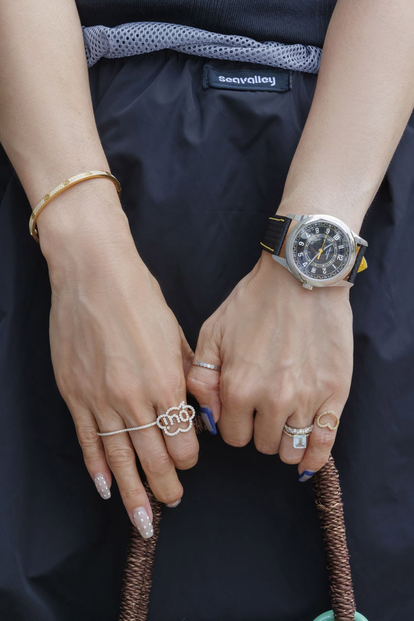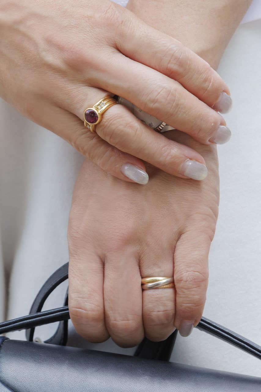 カフェに行く時はTシャツとスウェットのカジュアルコーデにジレを合わせて華やぎをプラス。ブルレアのスウェットパンツはサイドに入ったスリットのおかげで美シルエットで、カジュアル過ぎないから買って以来ヘビロテ。結婚指輪のカルティエのトリニティと、祖母から頂いたルビーのリングをサンダルのカラーとさりげなくリンクさせました。