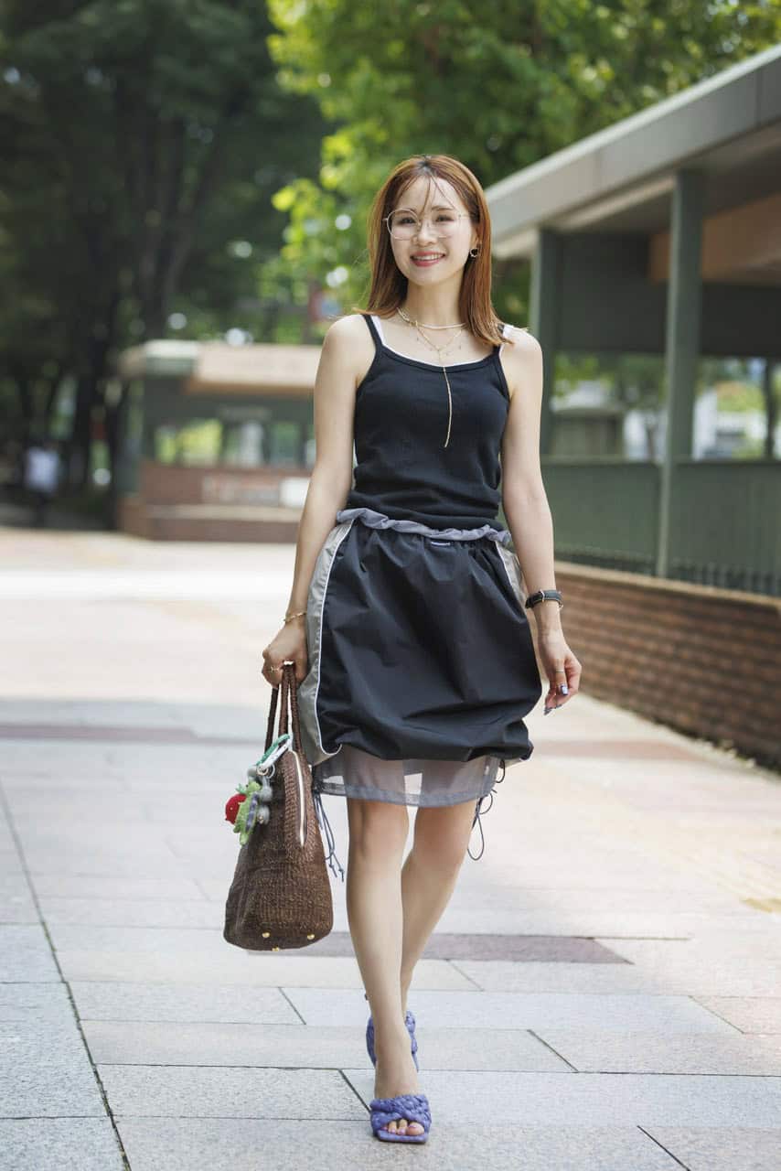 今年に入ってアイウェア熱が急加速。ハイブランドも好きですが、手頃な価格でトレンドが揃うOWNDAYSは必ずチェックします。メガネをひとつ加えることでコーデの雰囲気がガラリと変わるので、ファッションの楽しさが広がりました。スポーティーカジュアルなスカートスタイルをミュールで女っぽく、細フレームメガネでモードさをプラスしました。