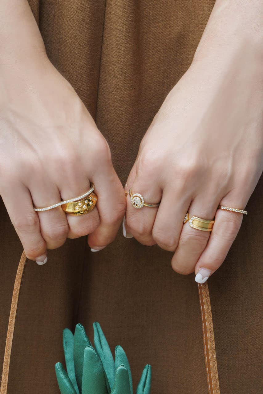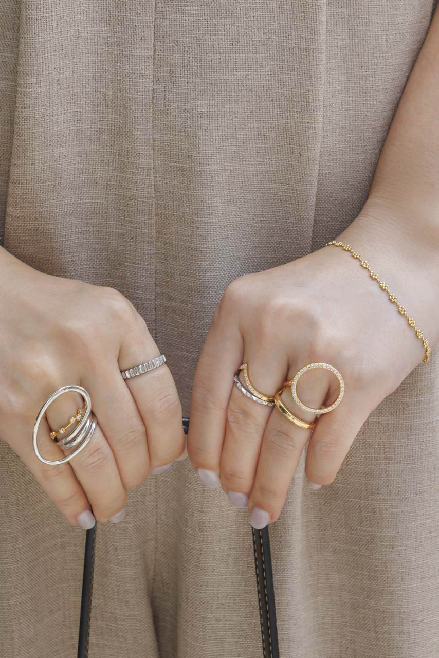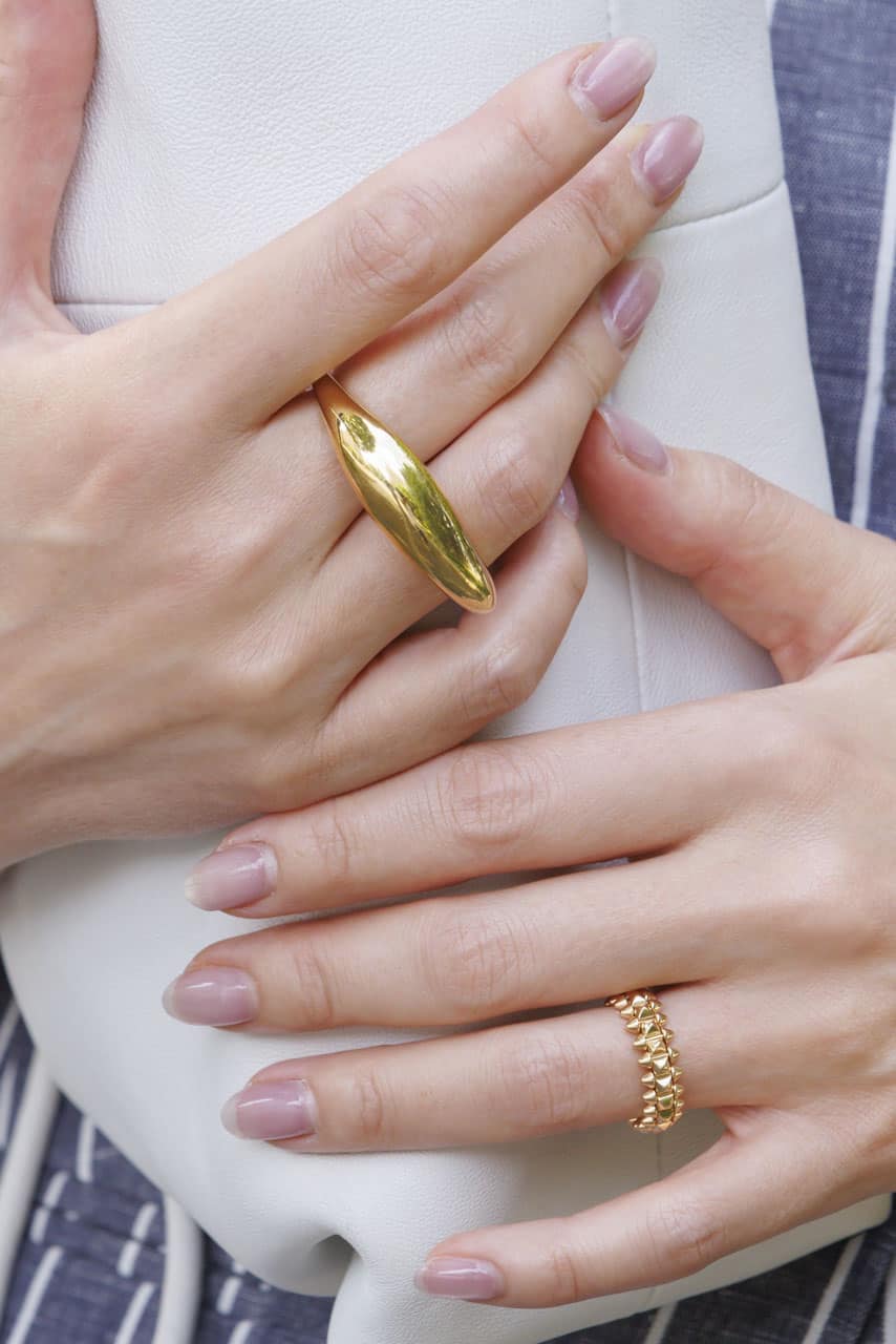 朝、身支度をして何か足りないと感じたら小物で調整。アクセサリーと同様、古く見えないようアイウェアもアップデートするように気をつけています。流行りのブラウンコーデには黒縁メガネだと浮いてしまうのでメタルフレームのメガネで馴染ませます。リングもゴールドを多めに効かせたのがポイント。