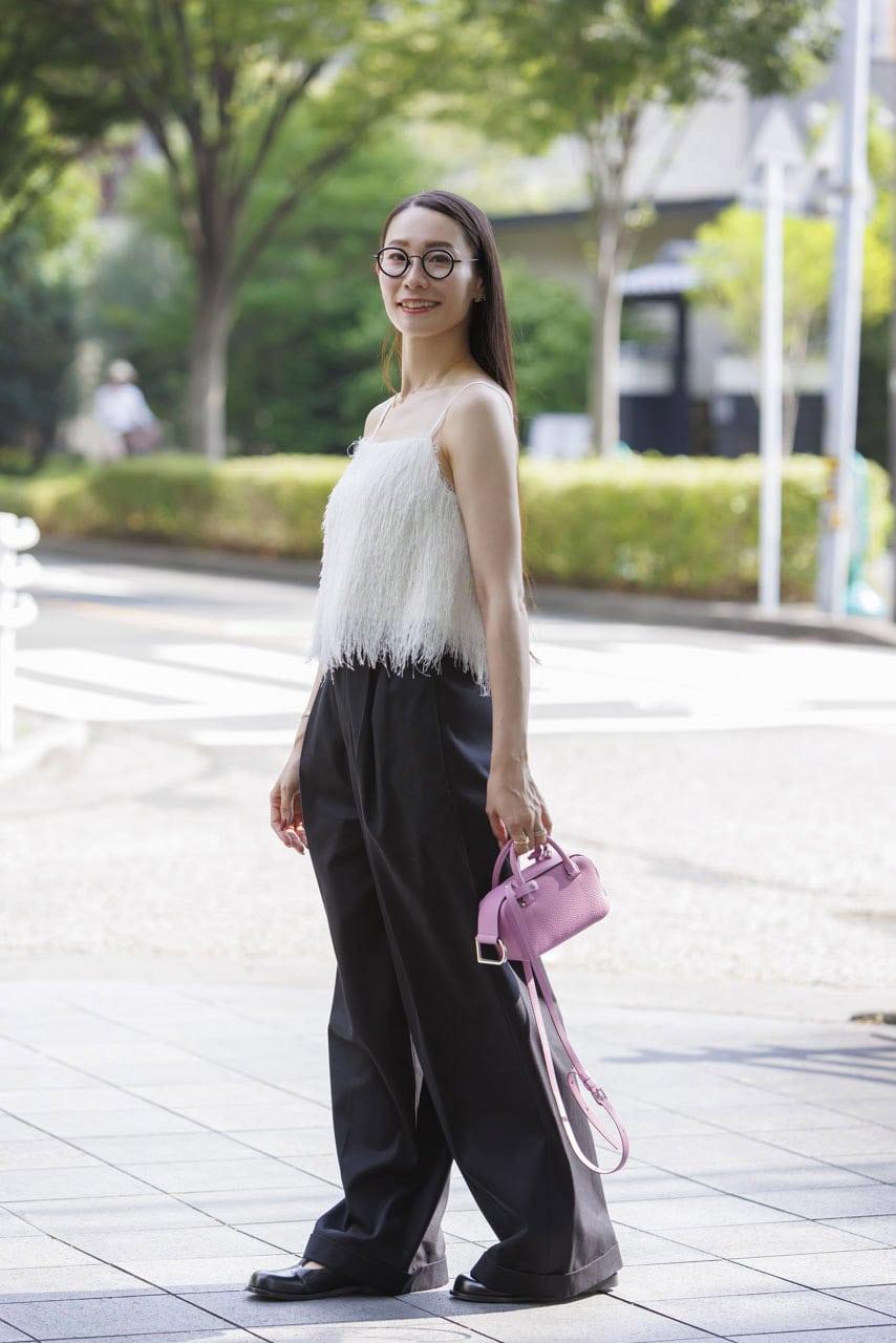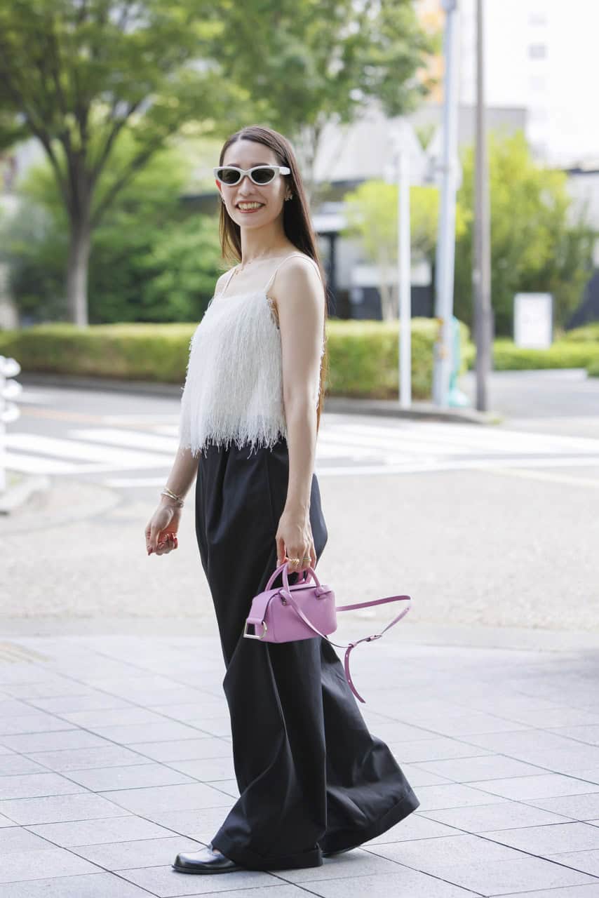 アイウェアはファッション感度を上げるためのブーストアイテム。25個くらいコレクションしていて、今年は4個購入しました。今日のコーデはメガネが主役。メガネ自体がモードなので白のフリンジトップスとピンクのバッグで可愛らしさをプラスしました。ジェントルモンスターとマルジェラのコラボサングラスは攻めたデザインとホワイトフレームがお気に入り。