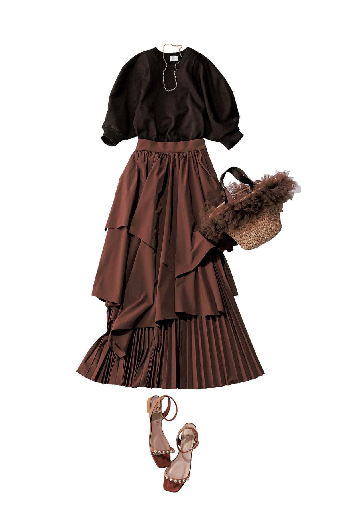 フレアがアシメントリーに重ねられた、高揚感たっぷりのスカート。旬のブラウンは白や黒よりも難易度が高そうだけれど、トーンを合わせれば失敗知らず。袖にデザインが効いたトップスなら、よりオシャレを底上げできます!