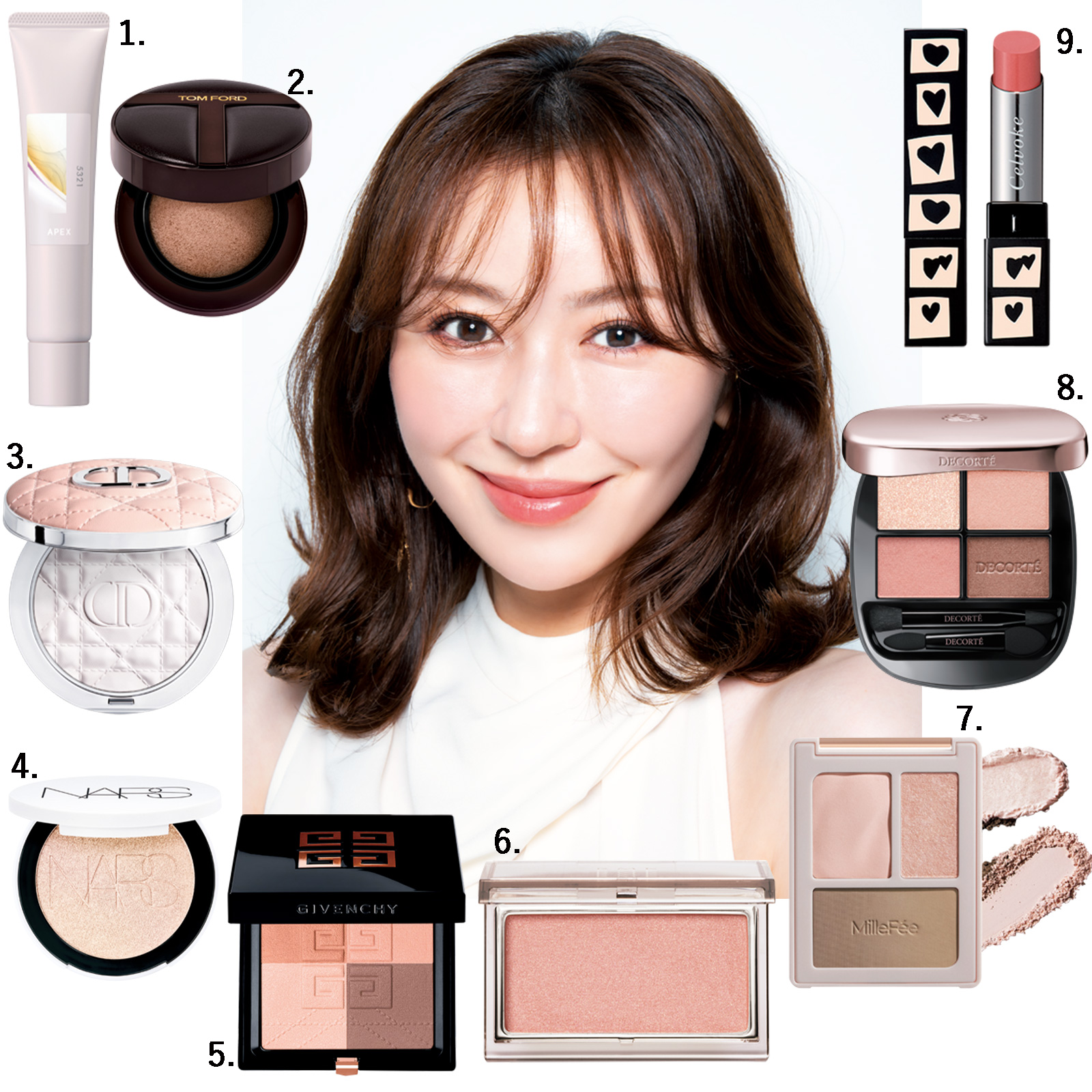 いちばん自分に合うコーラル系で統一。さらに上品なラメやハイライトを取り入れ、ツヤのある多幸感メークに。まず1ポーラ アペックス のUVベースと2 トム フォードのクッションファンデ、レフ板級の3 ディオールのパウダーでツヤ肌を作ったら、4 NARSの新作ハイライトで追いツヤ。さらに5 ジバンシイのシェーディングを大きめのブラシでフェイスラインにのせ、6 RMKのチーク(14番)、7 ミルフィーのマルチパレットでメリハリをオン。目元は8 コスメデコルテ(06番)、リップは9 セルヴォーク(01番)で自然なツヤと血色を纏わせて。