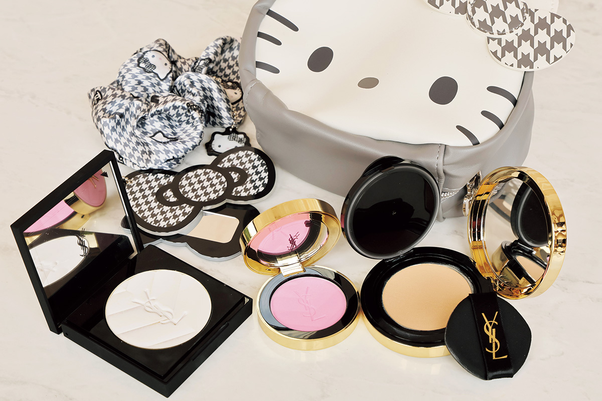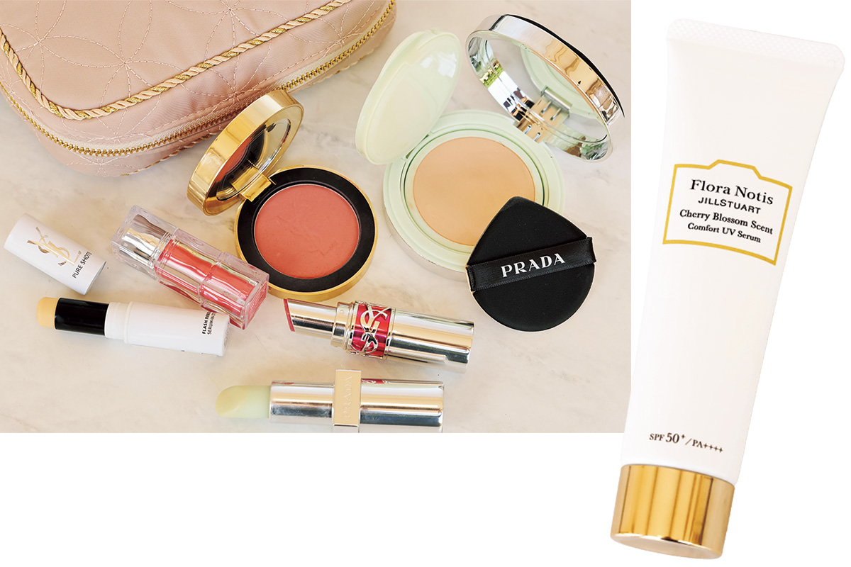 出先でのベースメイク直しは鼻周りのみ。テカリをティッシュオフしたらイヴ・サンローランのピュアショット セラムインスティックを塗り、プラダのメッシュ クッションを重ねます。フローラノーティスジルスチュアートのコンフォートUVセラムはいい香りでお気に入り。