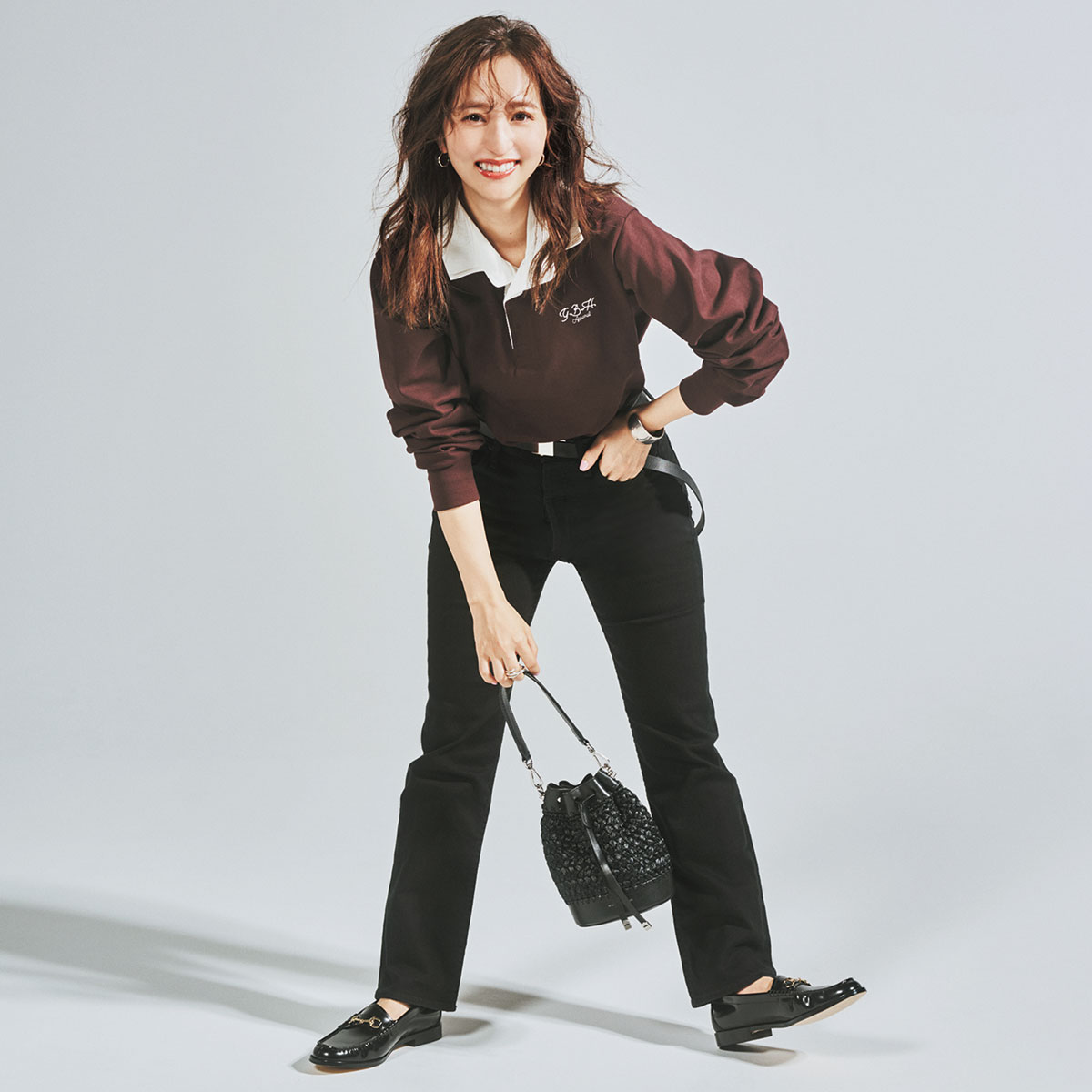 ラガーシャツはカジュアルでボーイッシュな印象が強いアイテム。でもブラウンベースを選べば落ち着いた雰囲気が加わり、大人らしく着こなせます。白襟のアクセントで顔まわりも明るく映え、黒パンツとローファーでまとめれば、女性らしさのあるきれいめカジュアルにシフト。