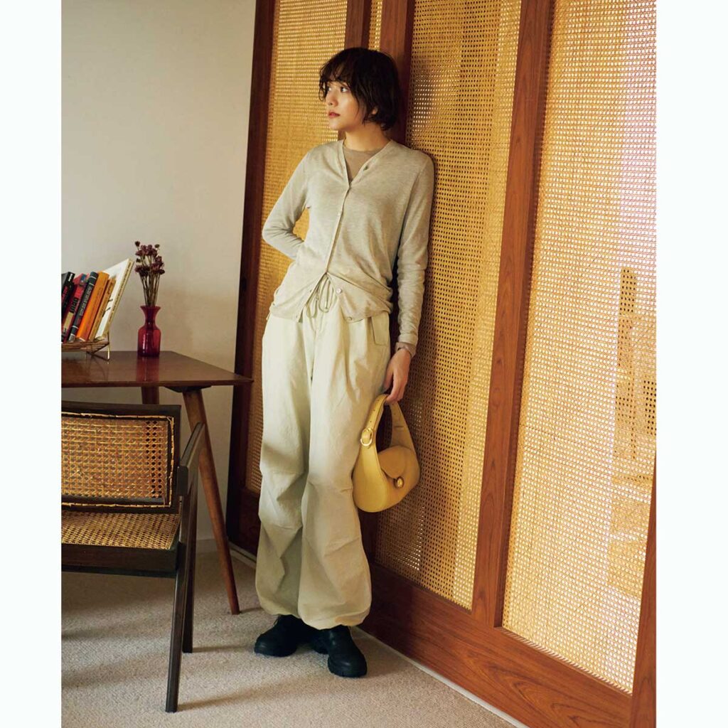 重ね着とトーンのグラデーションで、ベージュスタイルに立体感を演出した休日スタイル。ゆったりとしたパンツも同系色でまとめるとリラックス感がありながらも品よく見えます。黒のシューズで引き締め、イエローのバッグでほんのり差し色を添えれば、単調になりがちなワントーンもぐっと今っぽい印象に。