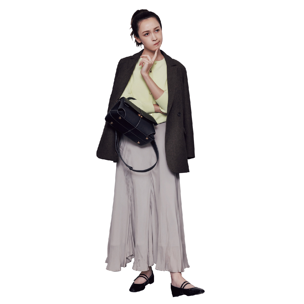 ブラウンのワントーンでまとめた落ち着いた装いに、レモンイエローのニットを一点投入。ほんのり効かせるだけで顔まわりが明るくなり、いつもの着こなしがフレッシュに更新されます。揺れ感のあるスカートや黒小物を合わせれば、華やかさと引き締め効果も両立。
