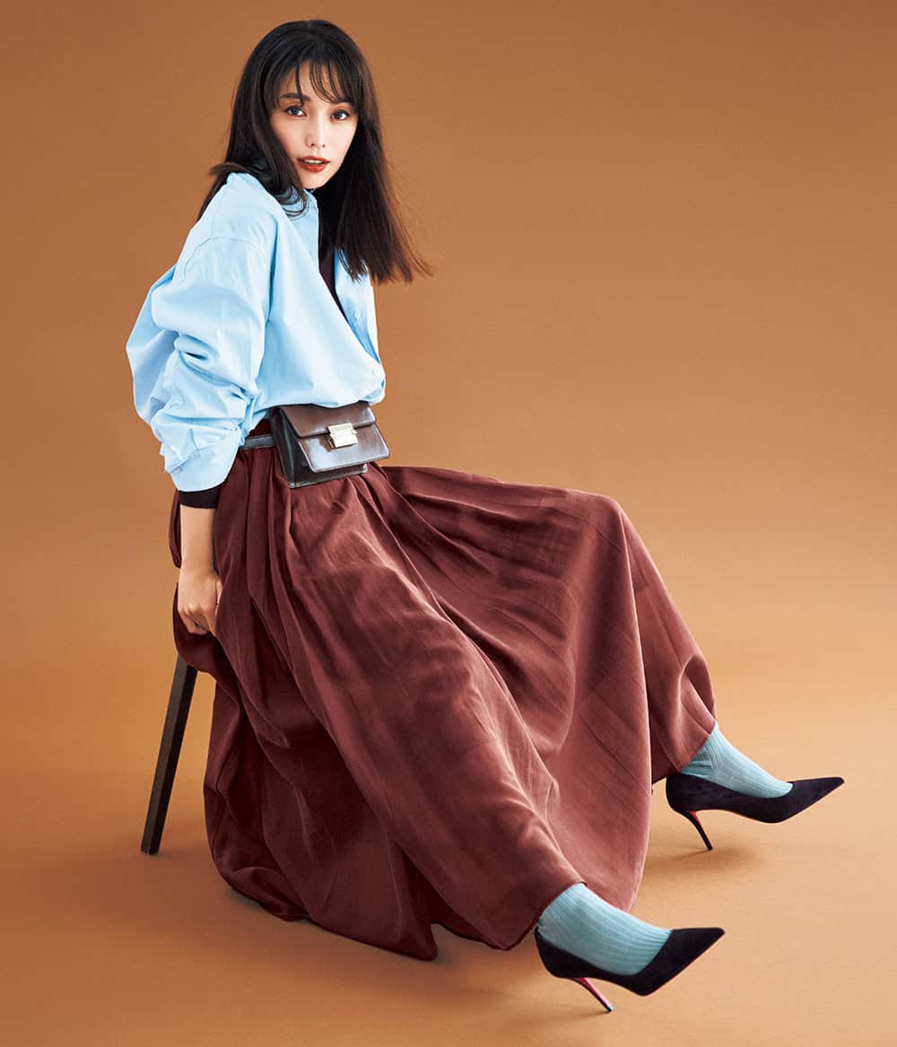 スカート¥13,200(ミラ オーウェン/ミラ オーウェン ルミネ新宿2店)タートルニット¥75,900(オムガールズ/ロンハーマン)シャツ¥42,900(シチズンズ・オブ・ヒューマニティ)バッグ¥31,900(モフィオラ/アマン)ソックス¥4,000(パンセレラ/真下商事)パンプス¥137,500(クリスチャン ルブタン/クリスチャン ルブタン ジャパン)