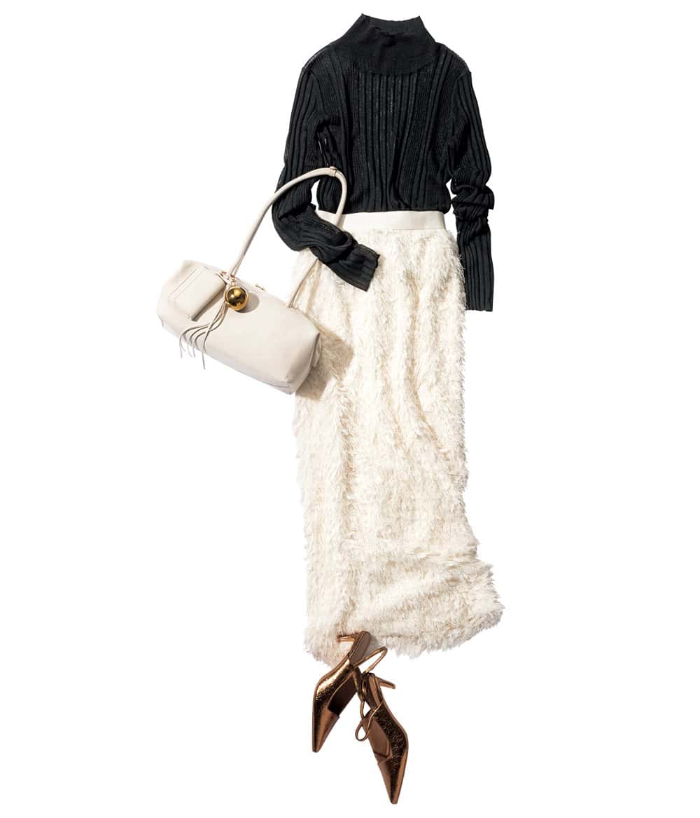 ハイネックシアーリブニット¥14,300 フェザーヤーンストレートスカート¥26,400 フリンジボストンバッグ¥16,500 ポインテッドトウミュール¥20,900(すべてELENDEEK)アクセサリー(スタイリスト私物)
