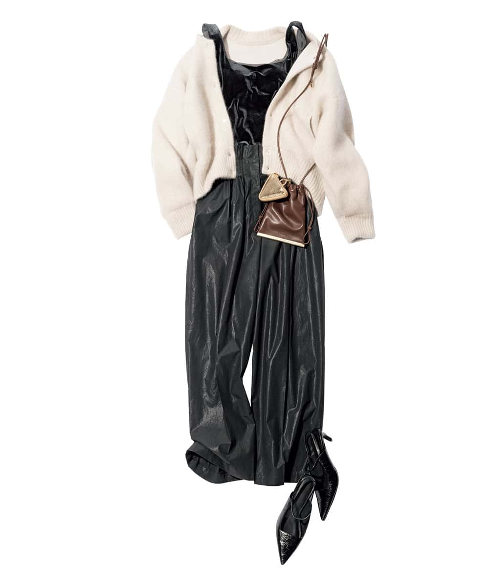 ベロアパッドタンクトップ¥13,200 ウエストピンタックパンツ¥26,400 カーディガン¥38,500 マルチショルダーバッグ¥13,200 ポインテッドトウミュール¥20,900(すべてELENDEEK)アクセサリー(スタイリスト私物)