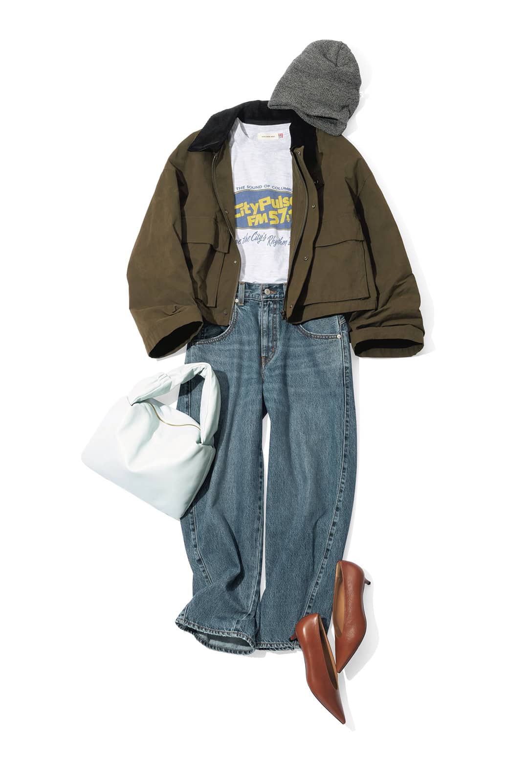 ジャケット¥86,900 (サクラ/インターリブ)Tシャツ¥6,380(グッドスピード)デニム¥15,400(リーバイス フォー ジャーナル スタンダード/ジャーナル スタンダード 自由が丘店)バッグ¥80,300(サルチェ/フラッパーズ)パンプス¥64,900(ペリーコ/アマン)ニット帽¥ 9,900(エイトンステイプルズ)