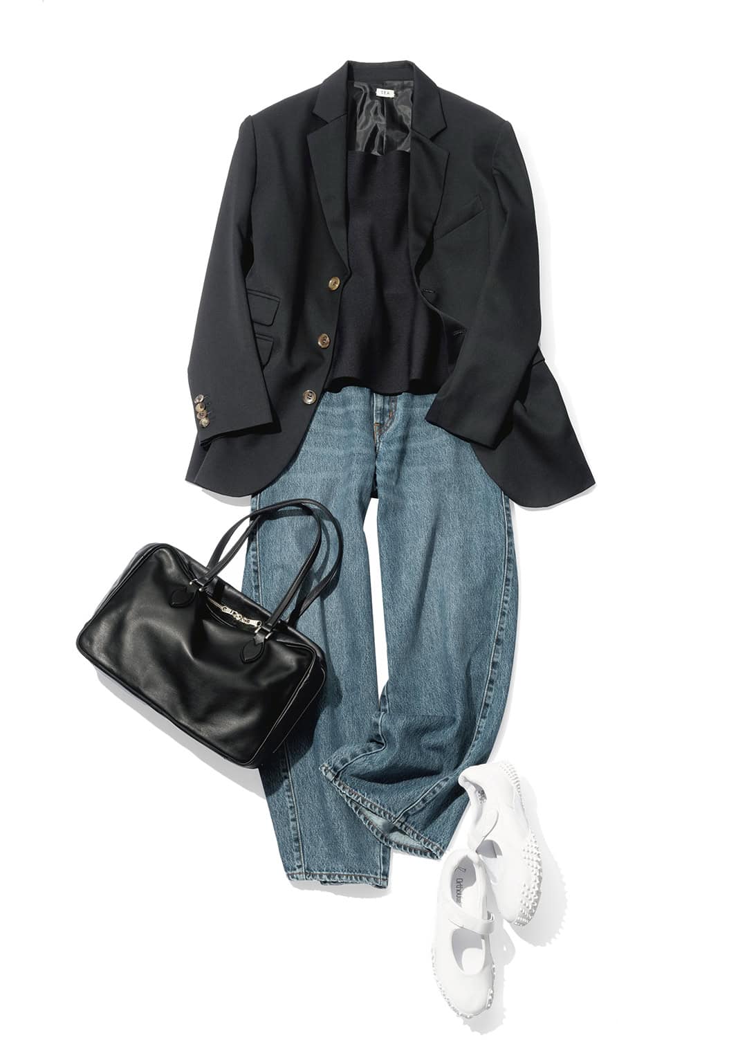 ジャケット¥61,600(シー/エスストア)ニットビスチェ¥27,500(サードマガジン)デニム¥15,400(リーバイス フォー ジャーナル スタンダード/ジャーナル スタンダード 自由が丘店)バッグ¥49,500(ラシット/ラシット 大丸梅田店)スニーカー¥15,400(プーマ/プーマ お客様サービス)