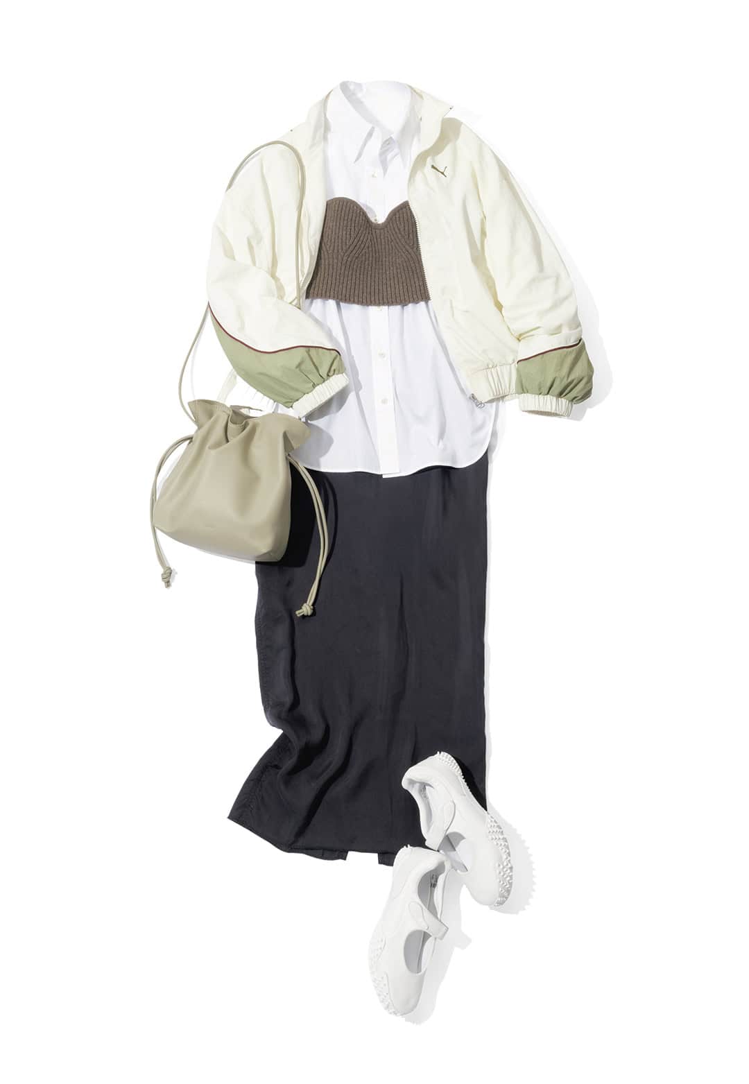 ナイロンジャケット¥9,900スニーカー¥15,400(ともにプーマ/プーマ お客様サービス)シャツ¥49,500(エステータ/オンワード樫山 お客様相談室)ビスチェ¥27,500(フィーニー)スカート¥33,000(イレーヴ)バッグ¥45,100(ヴァジック/ヴァジックジャパン)