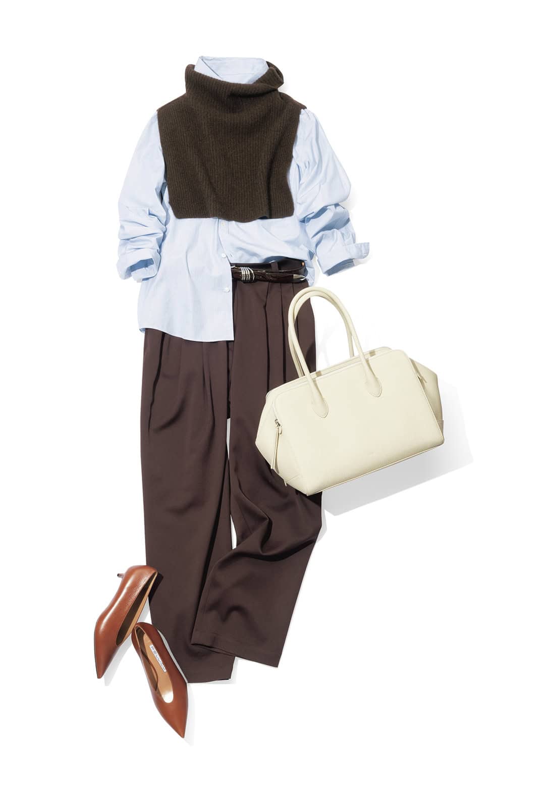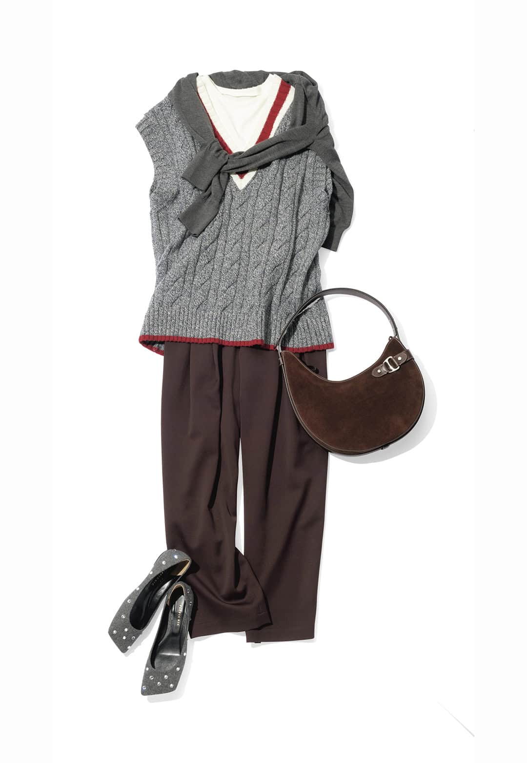 ニットベスト¥9,460(ミラ オーウェン/ミラ オーウェン ルミネ新宿2店)Tシャツ¥12,100(HER.)カーディガン¥47,300(チノ/モールド)パンツ¥49,500(アロー) バッグ¥62,700(ローレン ラルフ ローレン/ラルフ ローレン)パンプス¥46,200(ピッピシック/ベイジュ)