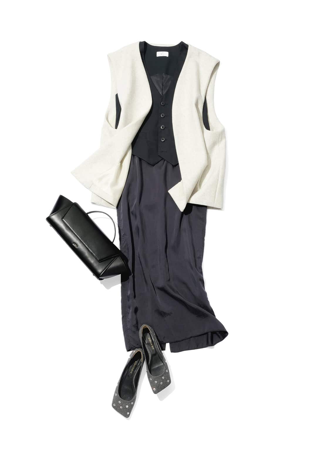 白ジレ¥44,000(ニコラ ジェンソン/リノウン)ネイビーベスト¥ 22,000(トウキョウ ウィークリー ジャーナル/バロック ジャパンリミテッド)スカート¥33,000(イレーヴ)バッグ¥ 134,200(ジュン ジー/コロネット)ピアス¥20,900ブレスレット¥49,500(ともにリューク)パンプス¥46,200(ピッピシック/ベイジュ)