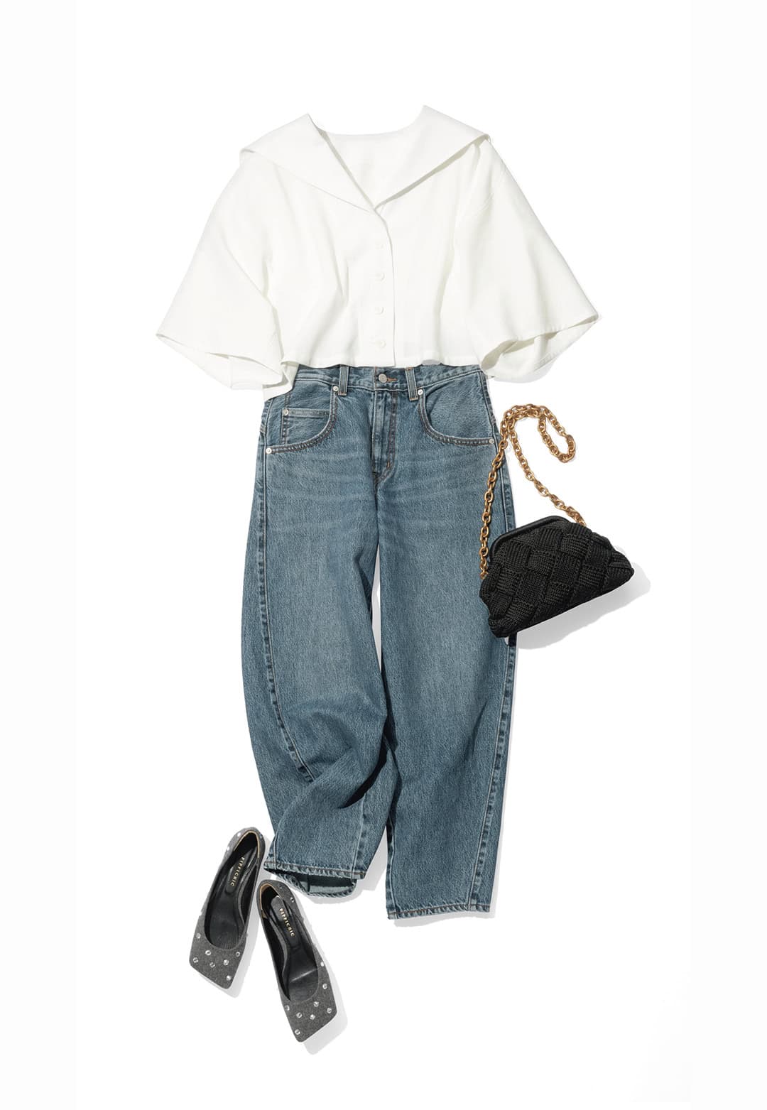 白甘ブラウス×デニムという定番スタイルの日こそ、新しい足元を意識したい。切れ味のあるワイドスクエアトウならデニム×フラットシューズでも、ほっこり見えしません。