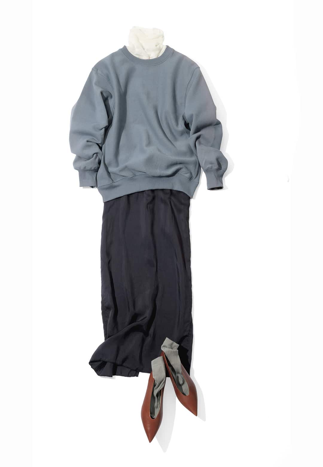 スウェット¥6,424(ユナイテッドアスレ/キャブ)シアータートルリブニット¥49,500(ルームエイト/オットデザイン)スカート¥ 33,000(イレーヴ)バッグ¥14,300(ツル バイ マリコ オイカワ)ソックス¥3,520(パンセレラ/真下商事)パンプス¥64,900(ペリーコ/アマン)ピアス¥24,200 パールネックレス¥121,000(ともにマユ/マユ ショールーム)