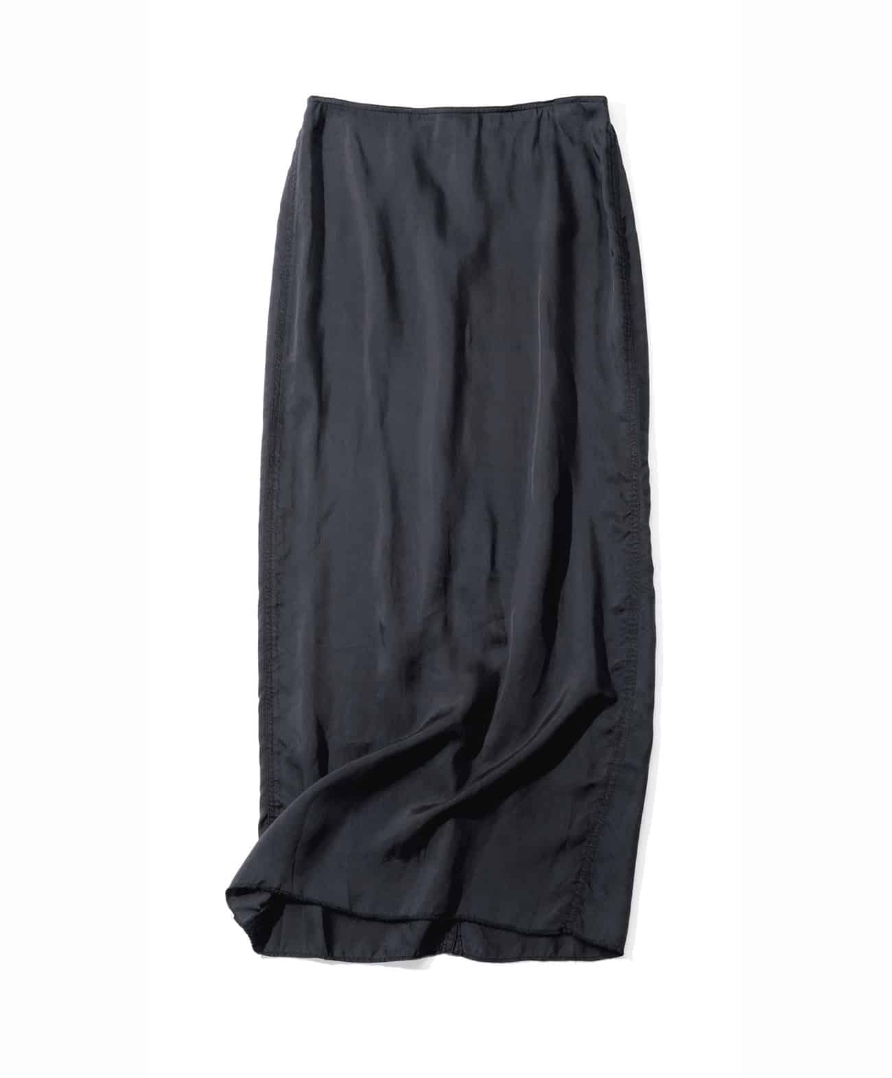 タイトスカートはくるぶしまでの超ロング丈が新鮮。サテンロングスカート¥33,000(イレーヴ)