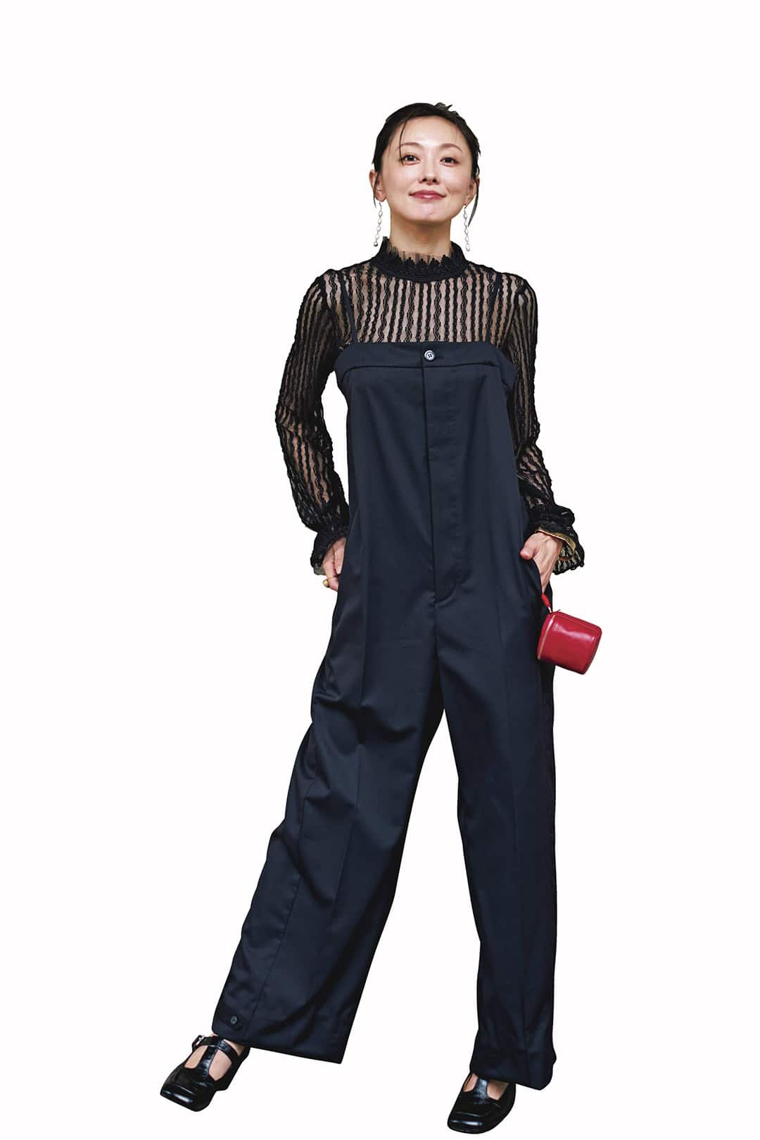 ガッツリ映えたい女子会にはレース使いが印象的なブラウスを合わせて。透けるアイテムもほぼクロのオールインワンなら派手に転ばず、大人にふさわしい華やかさが手に入ります。アクセサリーのようなミニバッグでお出掛けのウキウキ気分を盛り上げて。