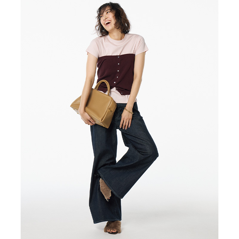パンツ¥28,600アンサンブルニット¥31,900(ともにヤヌーク/カイタックインターナショナル)Tシャツ¥5,940(アンクレイヴ/オンワード樫山 お客様相談室)バッグ¥42,900(トーヴ/アンソロジー)シューズ¥31,900(ペリーコ サニー/アマン)ピアス¥26,400ブレスレット¥73,700(ともにブランイリス/ブランイリス トーキョー)
