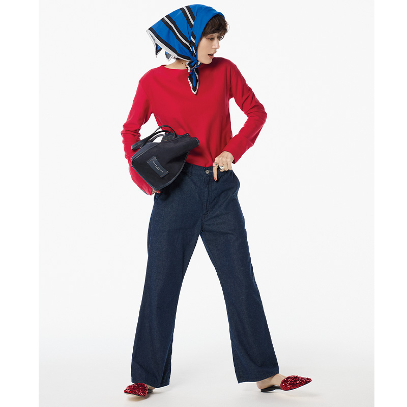 パンツ¥25,300(ボニーウーブン/クローバーズ)カットソー¥25,300(オーラリー フォー ロンハーマン/ロンハーマン)バッグ¥64,900(ジャンニ キアリーニ/ジャンニ キアリーニ 銀座店)シューズ¥31,900(ペリーコ サニー/アマン)スカーフ¥14,000(バナナ・リパブリック)リング[人差し指]¥35,200[中指]¥68,200(ともにブランイリス/ブランイリス トーキョー)