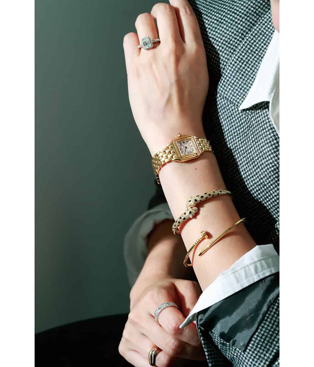 しなやかなブレスレットが華奢な腕にもフィットする憧れのアイコンモデル。ブレスを重ねてより自分らしく。時計「パンテール ドゥ カルティエ」〈18KYG、23㎜×30㎜、クォーツ、18KYGブレスレット〉¥3,894,000 ブレスレット(中央)〈18KYG×オニキス × エメラルド×DIA〉¥9,438,000(右)〈18KYG〉¥599,500左手薬指リング〈プラチナ×DIA〉¥13,200,000(参考価格)右手人差しリング〈18KWG×DIA〉¥1,254,000右手薬指リング〈18KWG×18KYG×18KPG〉¥350,900イヤリング〈18KYG×DIA〉¥947,760(すべてカルティエ/カルティエ カスタマー サービスセンター)ジャケット¥224,400パンツ¥137,500(ともにアスペジ/トヨダトレーディング プレスルーム)シャツ¥26,400(ティッカ)メガネは本人私物/span>