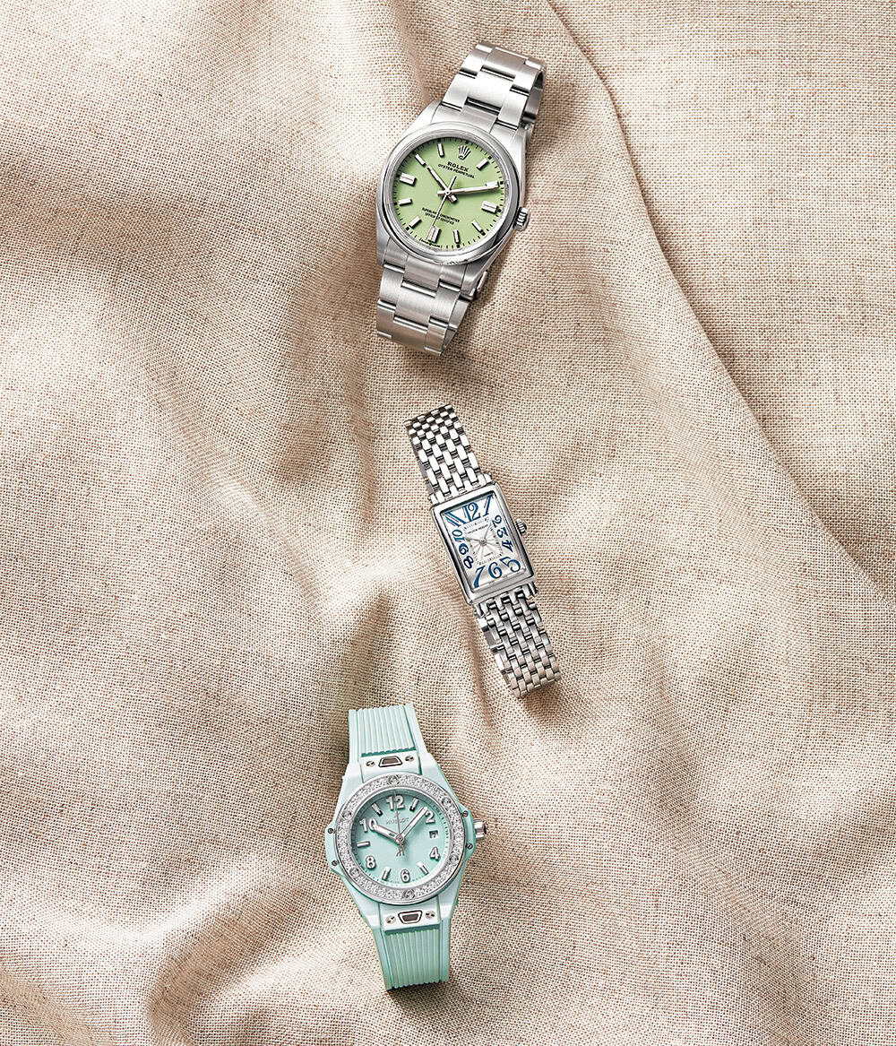 ウブロ独自の技術で生み出された希少なミントグリーンのセラミック。「ビッグ・バン ワンクリック ミントグリーン セラミック ダイヤモンド」〈SS×DIA、33㎜、自動巻き、ラバーストラップ〉¥2,398,000(ウブロ/LVMHウォッチ・ジュエリー ジャパン ウブロ)