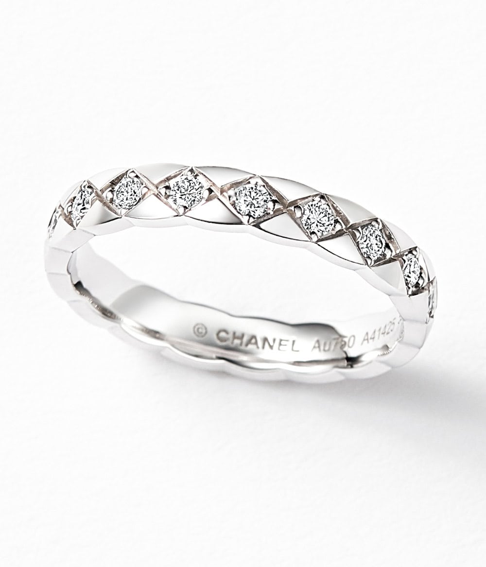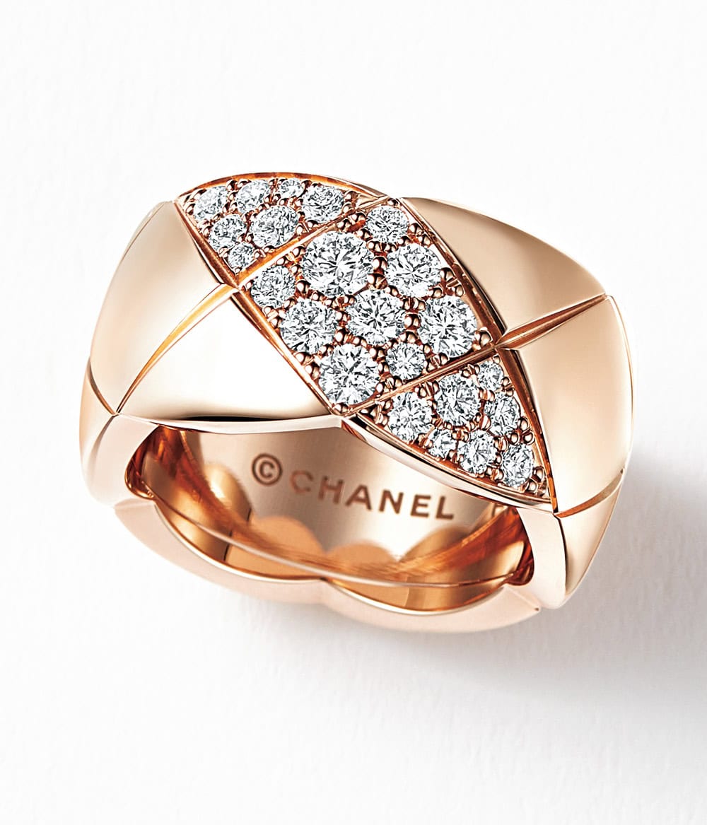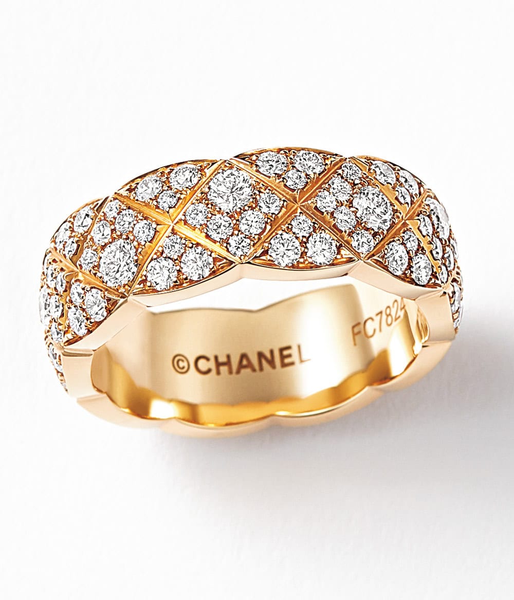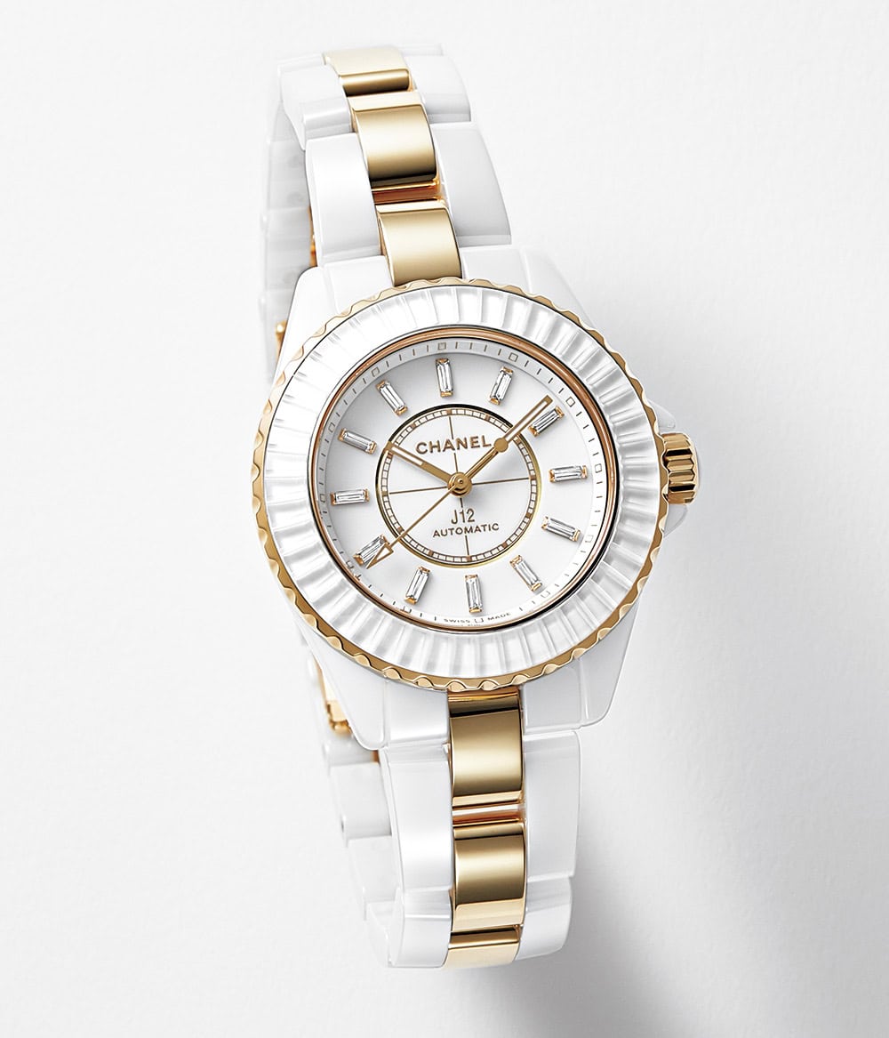 高耐性ホワイト セラミックに18Kイエローゴールドを合わせたインパクト抜群のデザイン。インデックスはダイヤモンド。時計「J12 キャリバー 12.2」〈高耐性ホワイト セラミック×18KYG × DIA、33㎜、自動巻き、高耐性ホワイト セラミック × 18KYGブレスレット〉¥5,181,000 重ねづけたブレスレット〈18Kベージュゴールド〉各¥858,000 左手中指リング〈18Kベージュゴールド × DIA〉¥1,991,000左手薬指リング(付け根)〈18KYG×DIA〉¥2,783,000(指先)〈18KWG×DIA〉¥775,500 ピアス〈18KWG×DIA〉¥1,111,000(すべてシャネル/シャネル カスタマー ケア センター)ドレス参考商品(ハルノブムラタ/ザ・ウォール ショールーム)/span>