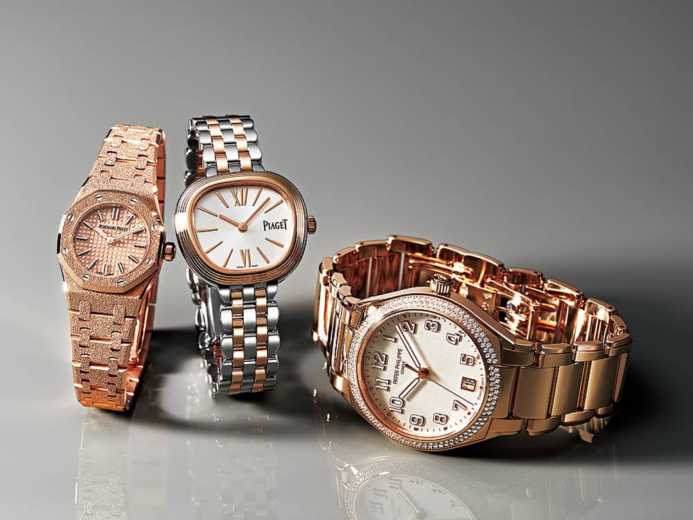 金属を叩いて加工する鍛金技術で仕上げられたフロステッドゴールド。赤みの強いピンクゴールドと23㎜の小さめのケース径のバランスも抜群です。「ロイヤル オーク ミニ フロステッドゴールド クォーツ」〈18KPG、23㎜、クォーツ、18KPGブレスレット〉¥5,225,000(オーデマ ピゲ/オーデマ ピゲ ジャパン)/span>