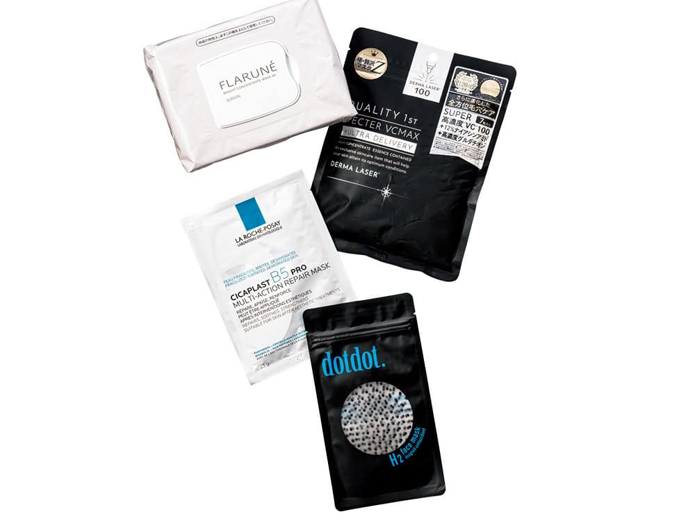 アイテム(上から時計回りに)フラルネ ブライトコンセントレート マスク 28 【医薬部外品】28枚入り ¥6,050/アルビオン、 ダーマレーザースペクター VCMAXマスクZ 7枚入り ¥1,320/クオリティファースト、 &themecell dotdot. シートマスク 水素パウダーセット 7セット ¥16,500/E.MIRAI、シカプラスト リペアマスク B5 プロ 5枚入り ¥4,290/ラ ロッシュ ポゼ