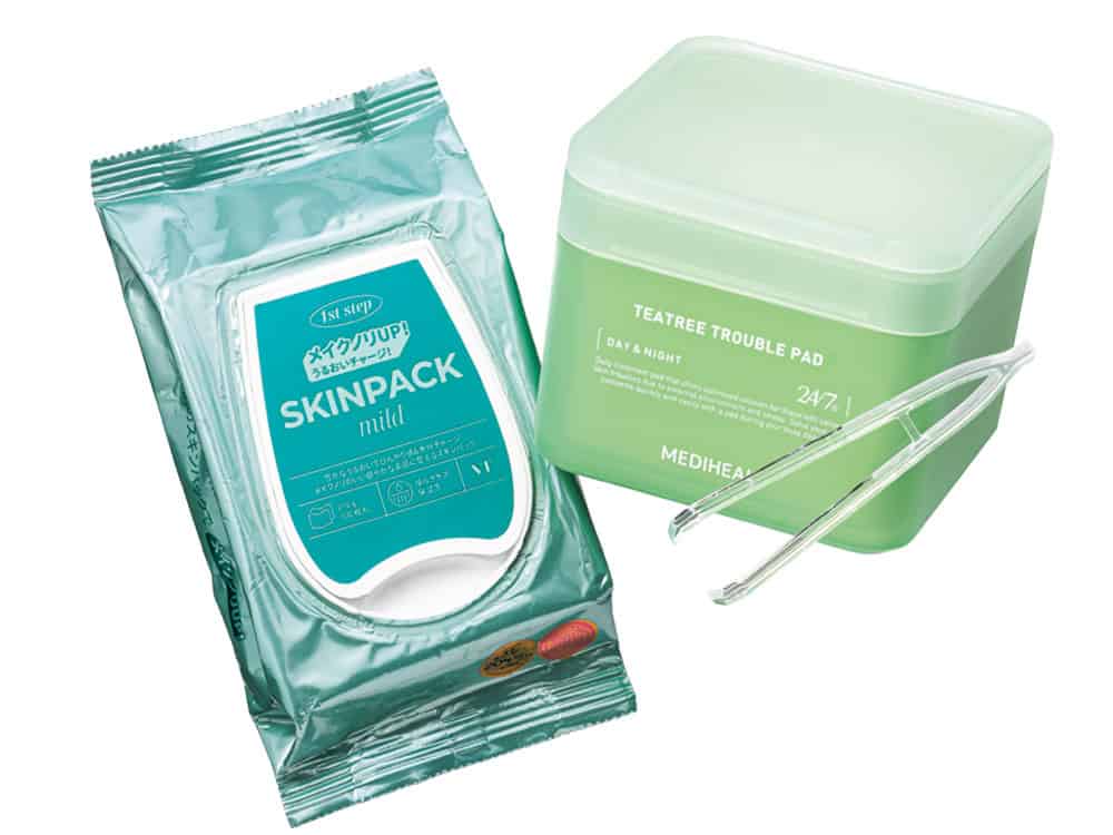 アイテム(左)VT マイルド スキンパック 100枚入り ¥1,650/VT COSMETICS (右)ティーツリー トラブルパッド 100枚入り ¥3,190/メディヒール(韓国高麗人蔘社)