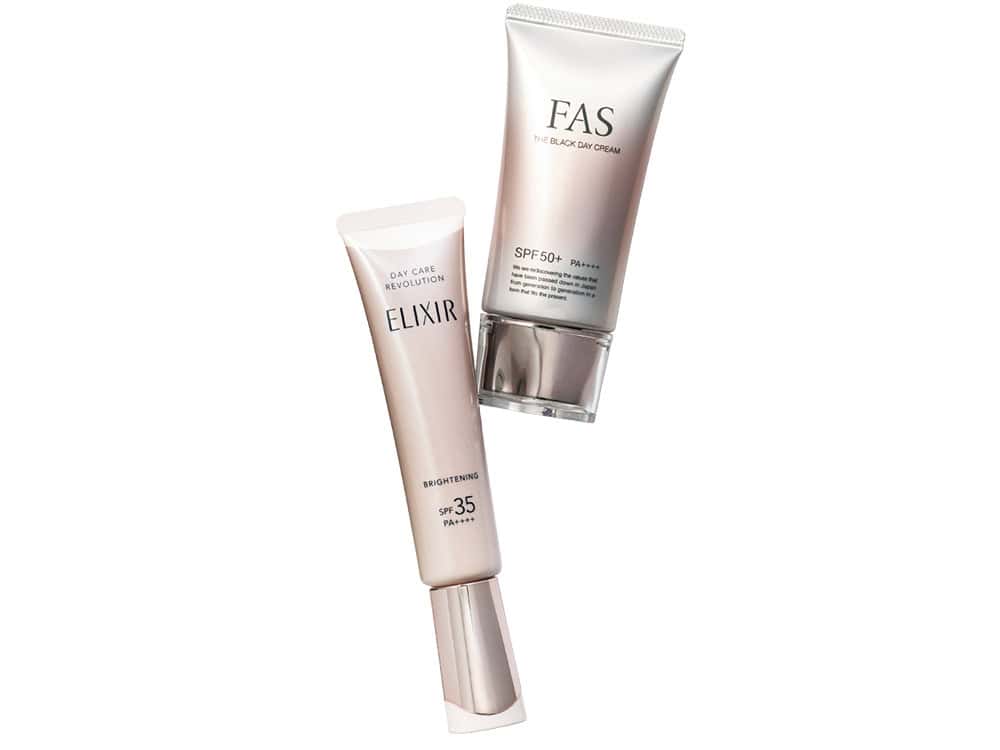 アイテム(左)エリクシール デーケアレボリューション ブライトニング ba 【医薬部外品】SPF35/PA++++ 35ml ¥3,740/エリクシール (右)FAS ザ ブラック デイ クリーム 【医薬部外品】SPF50+/PA++++ 40g ¥6,600/シロク