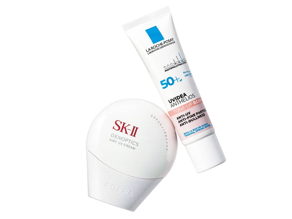 アイテム(左)SK-II ジェノプティクス エアリー UV クリーム SPF50+/PA++++ 30g ¥9,900(編集部調べ)/SK-II (右)UVイデア XL プロテクショントーンアップ ローズ+ SPF50+/PA++++ 30ml ¥3,960/ラ ロッシュ ポゼ