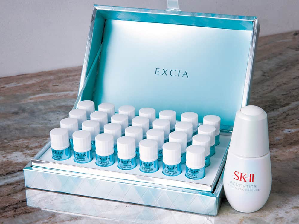 (左)エクシア ブライトニング イマキュレート セラム Z 【医薬部外品】28個 ¥27,500/アルビオン (右)SK-II ジェノプティクス インフィニットオーラ エッセンス 【医薬部外品】30ml ¥22,000(編集部調べ)/SK-II