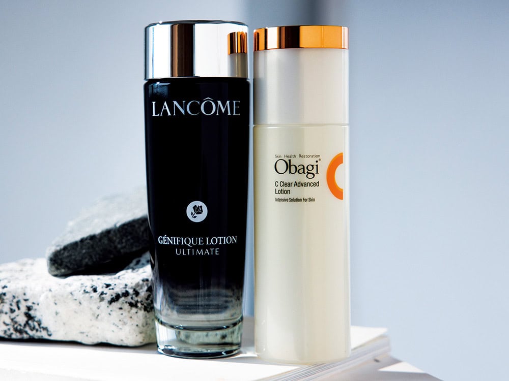 (左)ジェニフィック アルティメ エッセンス ローション 150ml ¥9,900/ランコム(右)オバジC クリアアドバンスドローション 150ml ¥4,950/ロート製薬