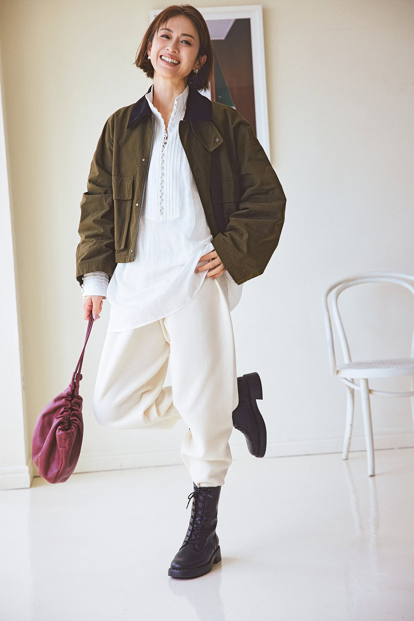 洗濯機OKで毛玉防止加工まで施された‟進化形ニットパンツ”。残暑の日も洗って清潔に保てるのが嬉しいポイント。カーキJKとレースブラウスを合わせ、ミリタリー感に甘さをひとさじ。動きやすくて初秋らしいコーデです。