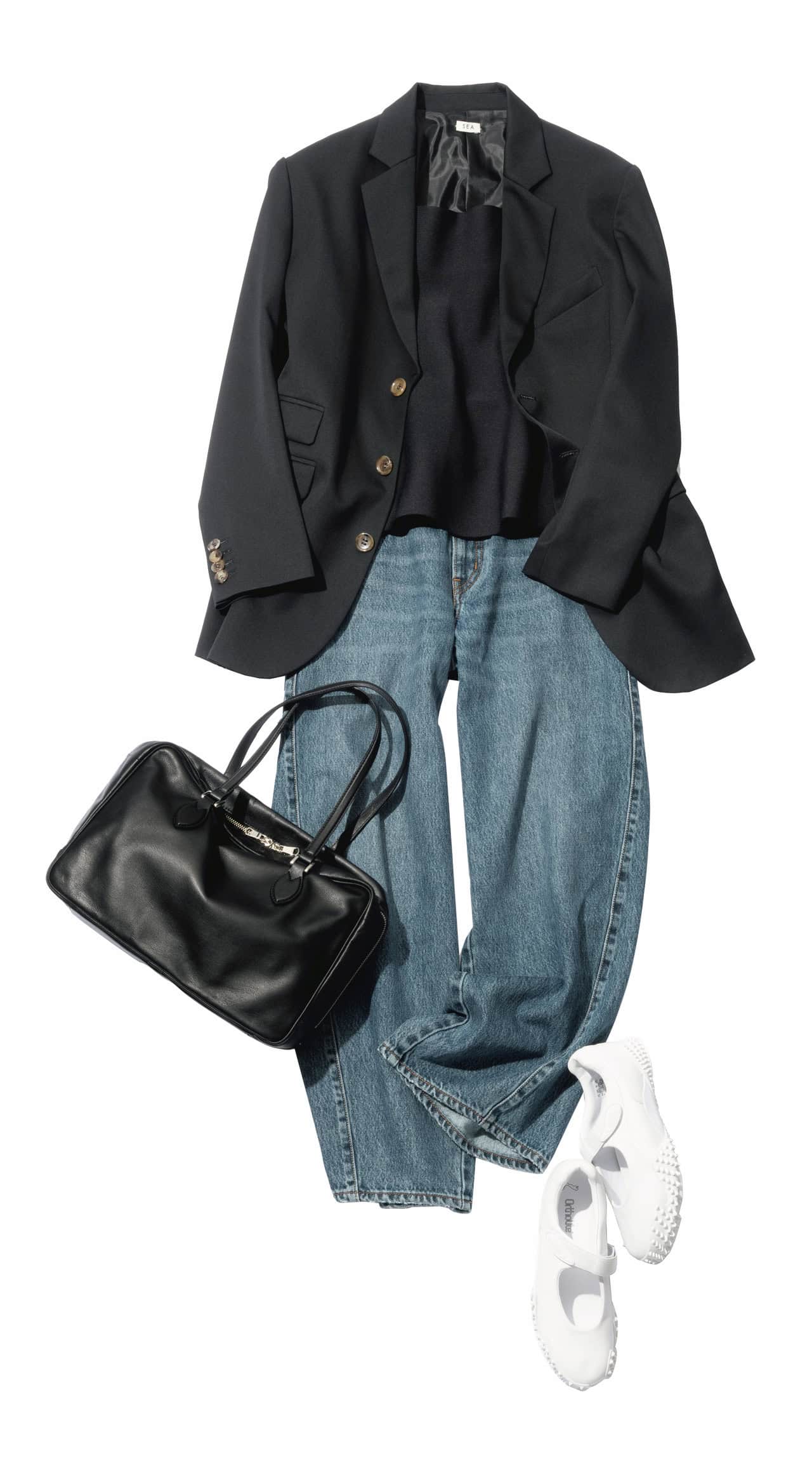 ジャケット¥61,600(シー/エスストア)ニットビスチェ¥27,500(サードマガジン)デニム¥15,400(リーバイス フォー ジャーナル スタンダード/ジャーナル スタンダード 自由が丘店)バッグ¥49,500(ラシット/ラシット 大丸梅田店)スニーカー¥15,400(プーマ/プーマ お客様サービス)
