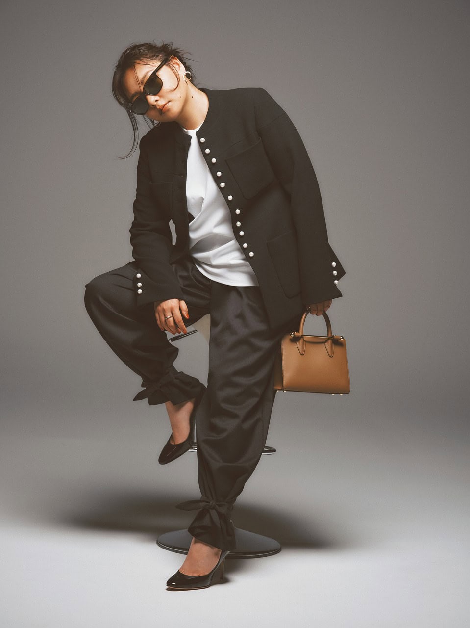 ジャケット¥106,700(Sea New York/S&T)トップス¥11,550(サードマガジン)パンツ¥31,900(エイチ ビューティー&ユース)バッグ¥84,700(ストラスベリー)パンプス¥59,400(ペリーコ/アマン)サングラス¥52,800(モスコット/モスコット トウキョウ)ピアス¥26,400リング¥19,800(ともにブランイリス/ブランイリス トーキョー)