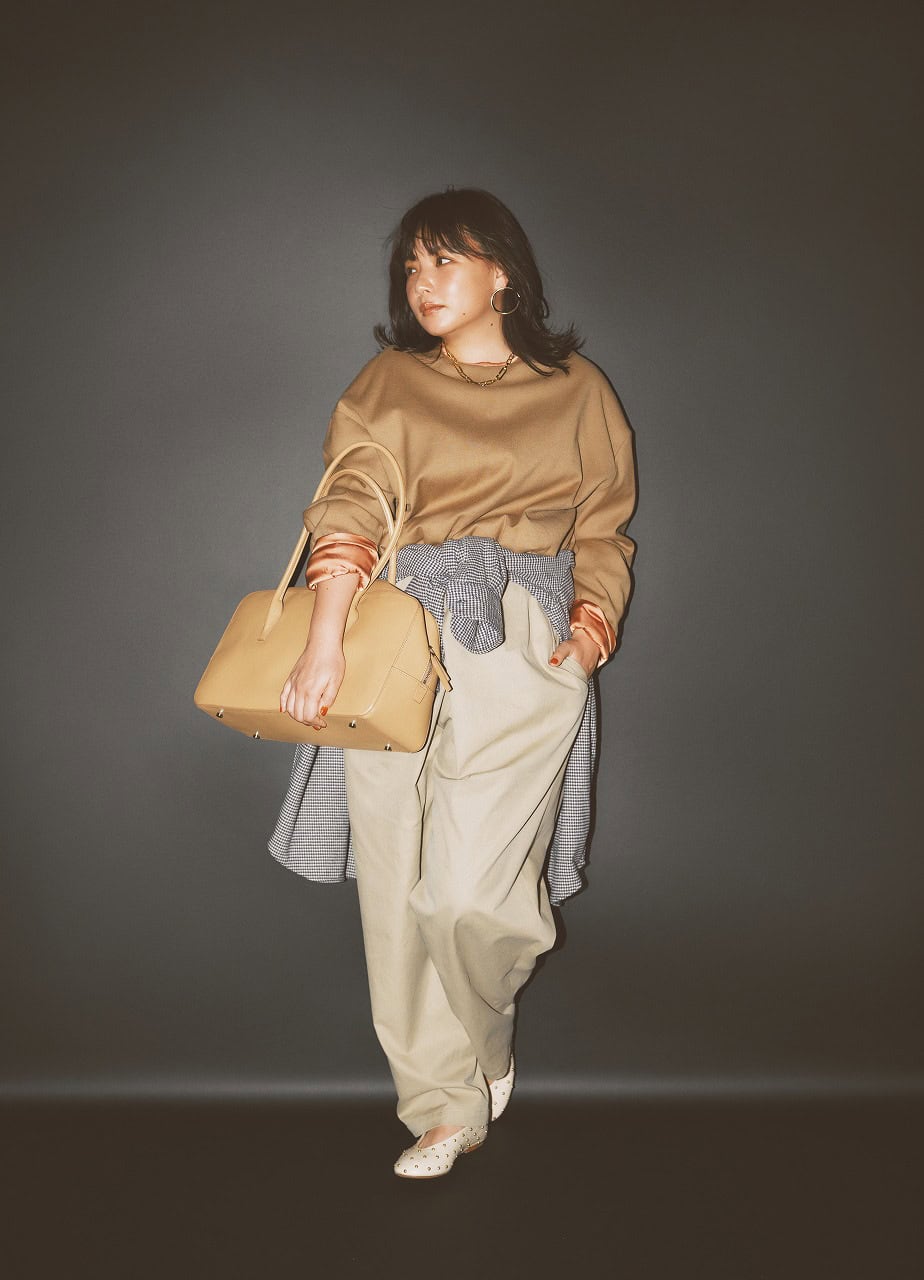 白パンツの太見えを回避する、腰巻きシャツのテクニック。ざっくりしたサイズ感のトップス&ボトムスも、ウエストマークすることでメリハリが生まれます。光沢のあるキャメルを合わせて全身を品よくまとめれば、秋らしい抜け感と女っぽさが両立する仕上がりに。