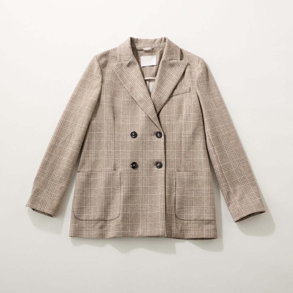 スウェットのような柔らかさと高い保温性を兼ね備えたダブルジャケット。ジャージー素材でストレッチ性があり、型崩れのしにくさも抜群。グレンチェックにはさりげなくピンクのラインが入っていて、着映え&顔まわりのトーンアップも叶えてくれます。肩パッドなしでも立体感があり、デコルテやバックスタイルもすっきり。シワになりにくく、出張からデスクワークの日まで頼れる一着です。