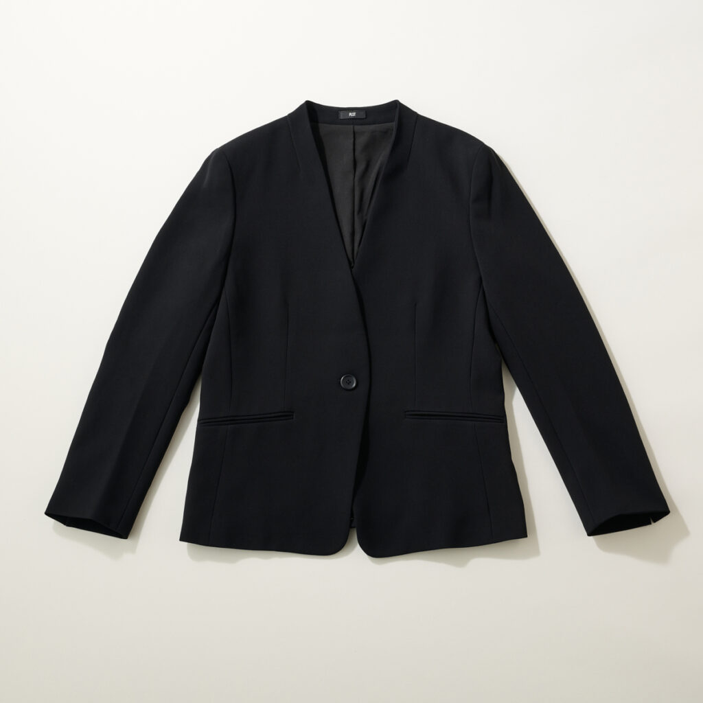 コンパクトな見た目なのに、動きやすく着心地のよさも兼ね備えたカラーレスジャケット。洗濯機で洗えてシワにもなりにくいから、お手入れも楽ちん。ボタンを開けてもラフになりすぎない、絶妙なシルエットが魅力です。ウエスト位置が高めに設定されていて腰のラインがすっきり見えるので、スタイルアップ効果も。通勤はもちろん、会食やクライアント対応など、きちんと感が欲しい場面で活躍してくれる一枚。