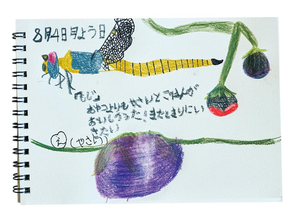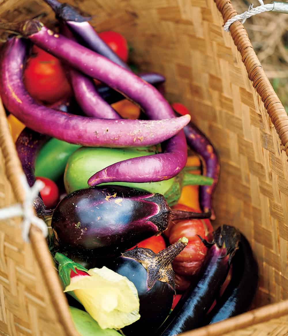 親子でENOWAのFARMへ。「これ昨日食べたよね!」昨夜のディナーメニューにあった様々な色のトマトを見つけて笑顔が溢れる高垣さん親子。石割農園・石割さんが監修する有機栽培のFARMには250品目の野菜がツヤツヤと輝き、蜂や蝶などの生き物が飛び交う。タシシェフは毎朝ここに訪れ、その日のメニューを考える。
