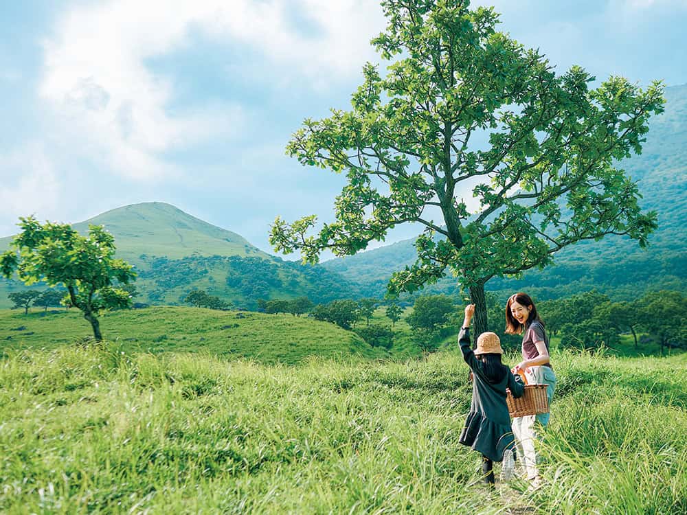 駐車場に車を停めて道を渡り、木々の中を歩くと、由布岳と緩やかな傾斜の芝生が目の前一面に。日本ではないどこかに来たのかと感じてしまうような想像をこえた雄大さに、誰もが立ち尽くすほど。なっちゃんは勢いよく走り出し、その姿を嬉しそうに眺める高垣さん。この物語のように美しい景色の中でタシシェフ特製のランチボックスを食べながらのんびり過ごすというピクニック体験がENOWAでスタートします。